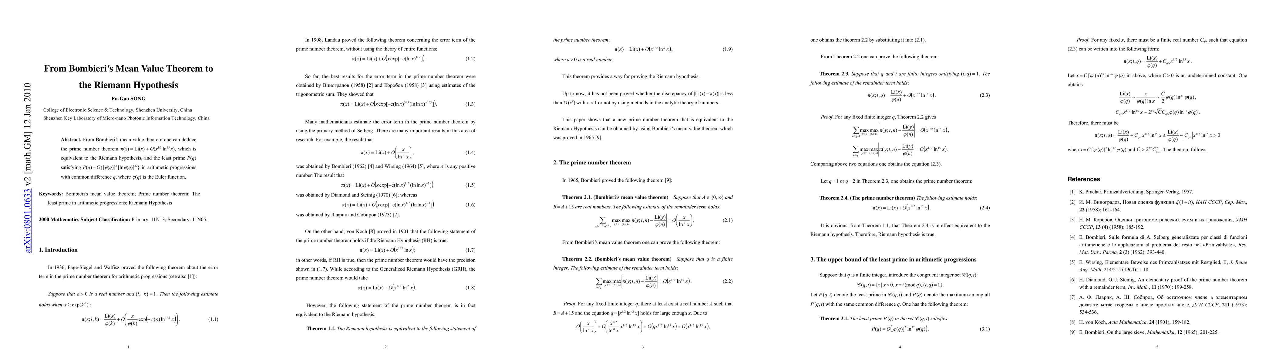 Summary: This paper demonstrates how Bombieri's mean value theorem implies the equivalence between the prime number theorem and the Riemann hypothesis, and establishes an upper bound for the least prime in arithmetic progressions as P(q) = O(q^2 [ln q]^32).