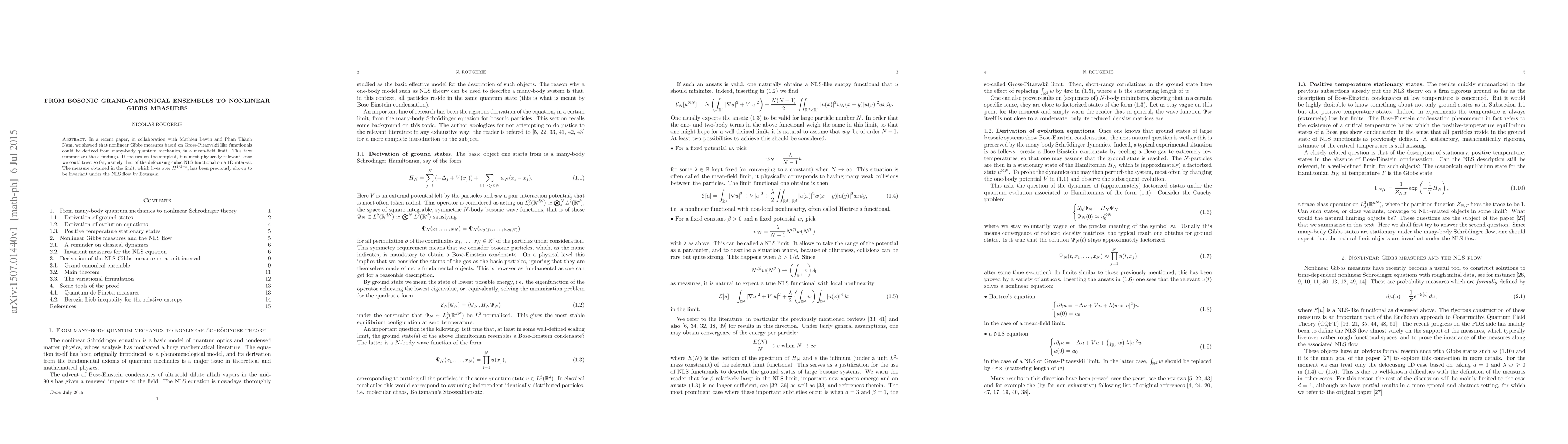 In a recent paper, in collaboration with Mathieu Lewin and Phan Th{\`a}nh Nam, we showed that nonlinear Gibbs measures based on Gross-Pitaevskii like functionals could be derived from many-body quantum mechanics, in a mean-field limit. This text summarizes these findings. It focuses on the simplest, but most physically relevant, case we could treat so far, namely that of the defocusing cubic NLS functional on a 1D interval. The measure obtained in the limit, which (almost) lives over H^{1/2} , has been previously shown to be invariant under the NLS flow by Bourgain.