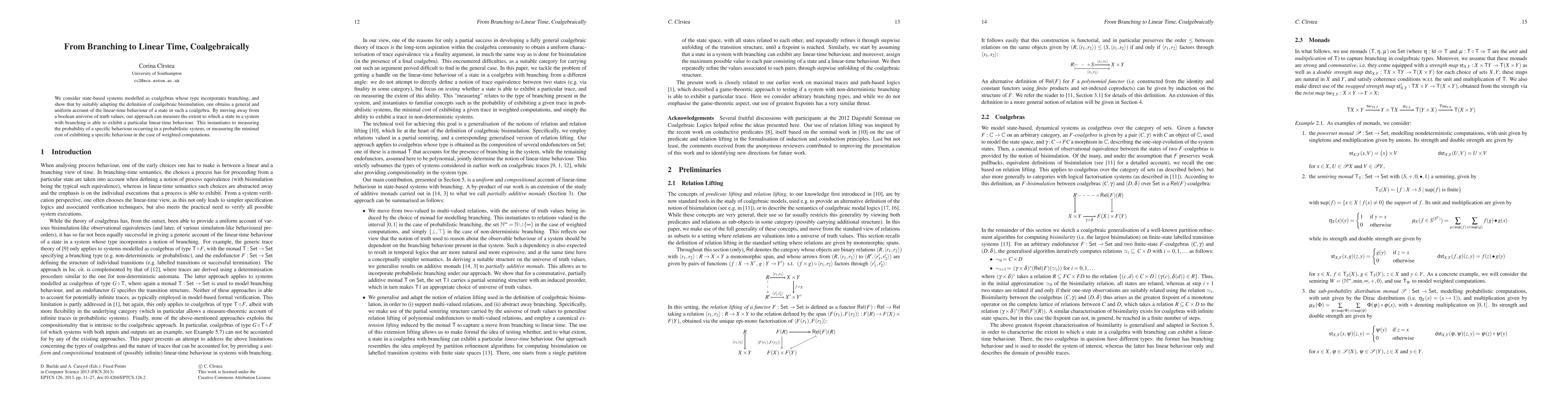 We consider state-based systems modelled as coalgebras whose type incorporates branching, and show that by suitably adapting the definition of coalgebraic bisimulation, one obtains a general and uniform account of the linear-time behaviour of a state in such a coalgebra. By moving away from a boolean universe of truth values, our approach can measure the extent to which a state in a system with branching is able to exhibit a particular linear-time behaviour. This instantiates to measuring the probability of a specific behaviour occurring in a probabilistic system, or measuring the minimal cost of exhibiting a specific behaviour in the case of weighted computations.