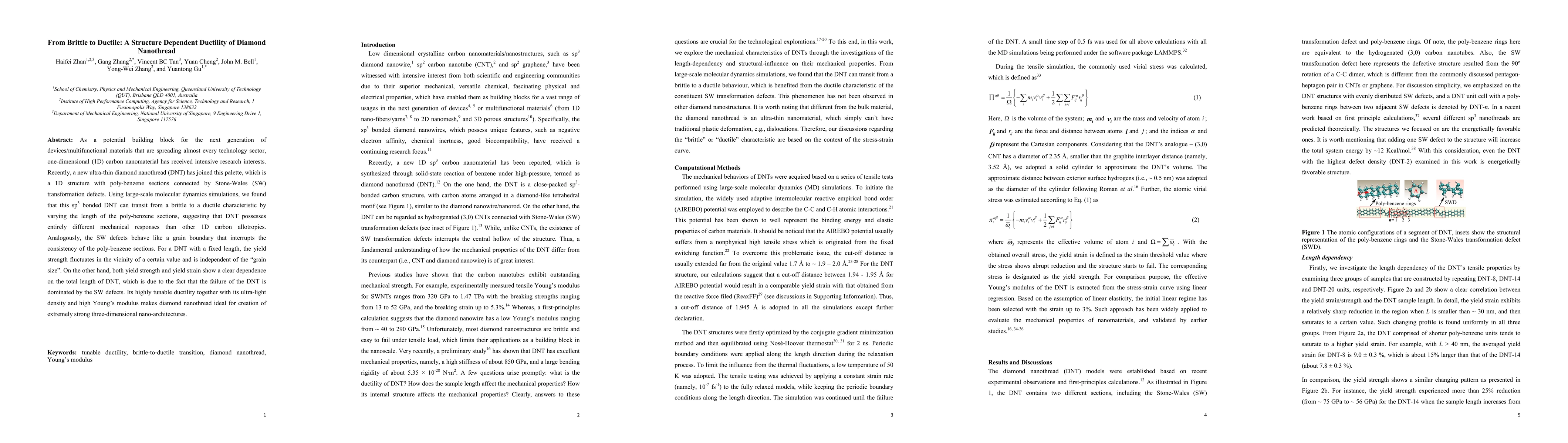 This paper investigates the mechanical properties of diamond nanothreads (DNT), revealing that their ductility can transition from brittle to ductile by adjusting the length of poly-benzene sections. The study shows that the presence of Stone-Wales defects acts like grain boundaries, influencing the material's yield strength and strain, and highlights DNT's potential for creating strong, lightweight nano-architectures.