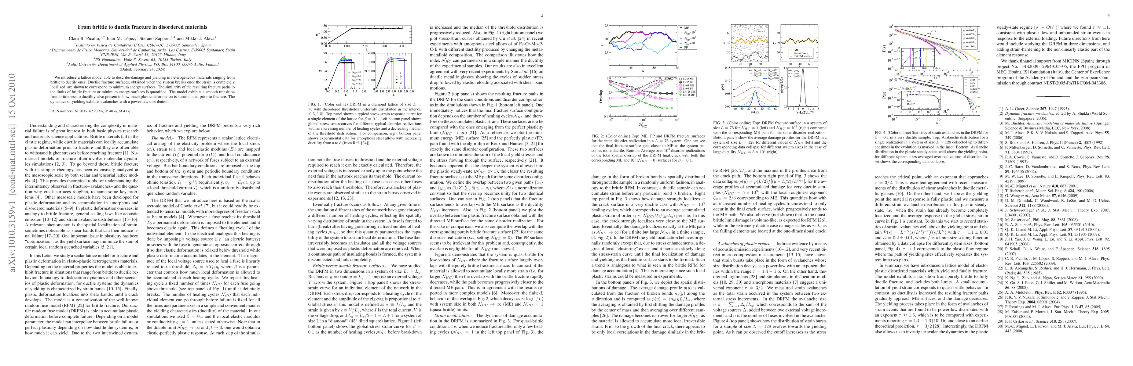 This paper proposes a lattice model to illustrate the transition from brittle to ductile fracture in disordered materials, demonstrating that ductile fracture surfaces correspond to minimum energy paths. The model captures a smooth shift from brittleness to ductility and shows yielding dynamics characterized by power-law distributed avalanches.