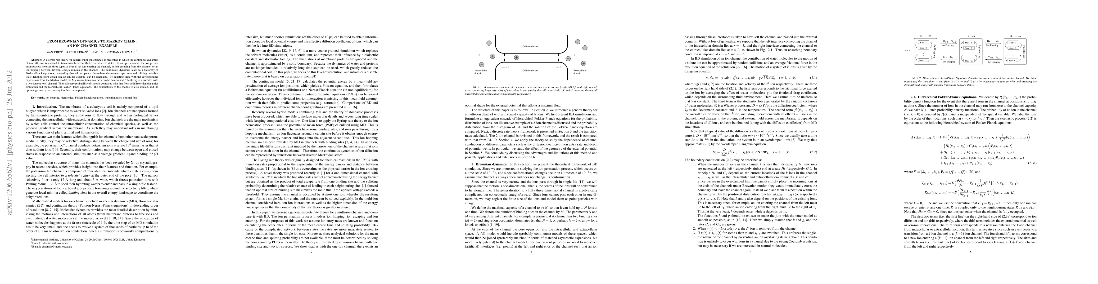 A discrete rate theory for general multi-ion channels is presented, in which the continuous dynamics of ion diffusion is reduced to transitions between Markovian discrete states. In an open channel, the ion permeation process involves three types of events: an ion entering the channel, an ion escaping from the channel, or an ion hopping between different energy minima in the channel. The continuous dynamics leads to a hierarchy of Fokker-Planck equations, indexed by channel occupancy. From these the mean escape times and splitting probabilities (denoting from which side an ion has escaped) can be calculated. By equating these with the corresponding expressions from the Markov model the Markovian transition rates can be determined. The theory is illustrated with a two-ion one-well channel. The stationary probability of states is compared with that from both Brownian dynamics simulation and the hierarchical Fokker-Planck equations. The conductivity of the channel is also studied, and the optimal geometry maximizing ion flux is computed.