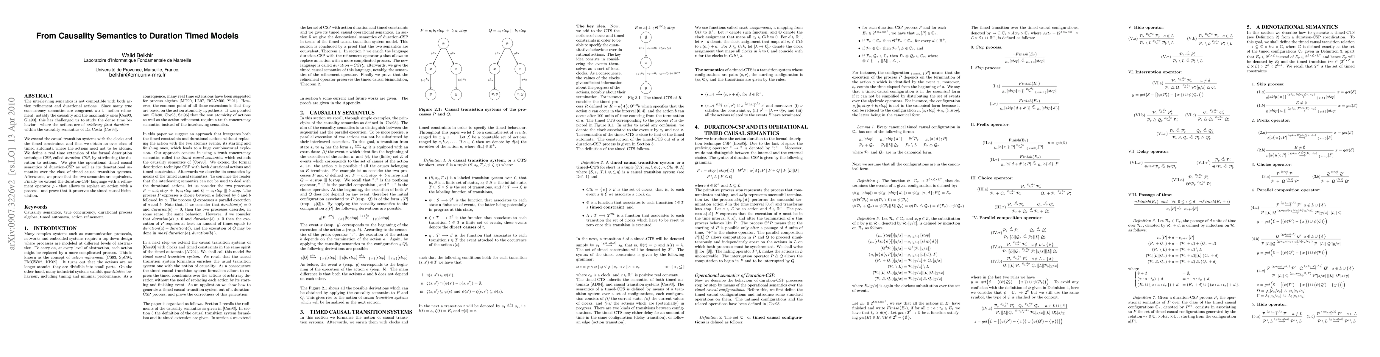 This research paper extends causal transition systems to include clocks and timed constraints, creating a new framework for modeling duration-timed actions. It establishes an operational and denotational semantics for the framework, demonstrating equivalence between the two and introducing a refinement operator that preserves bisimulation.