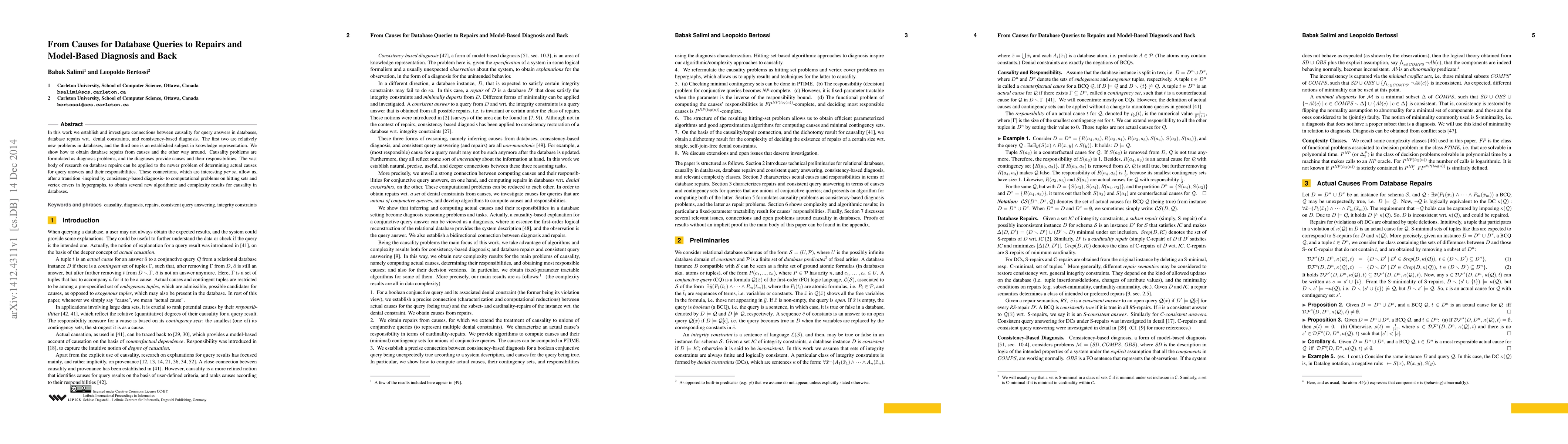 This paper explores the relationships between causality in database query answers, database repair techniques, and consistency-based diagnosis, establishing methods to derive database repairs from causal information and vice versa. It leverages established diagnosis techniques to develop new algorithms and complexity results for determining query answer causes.