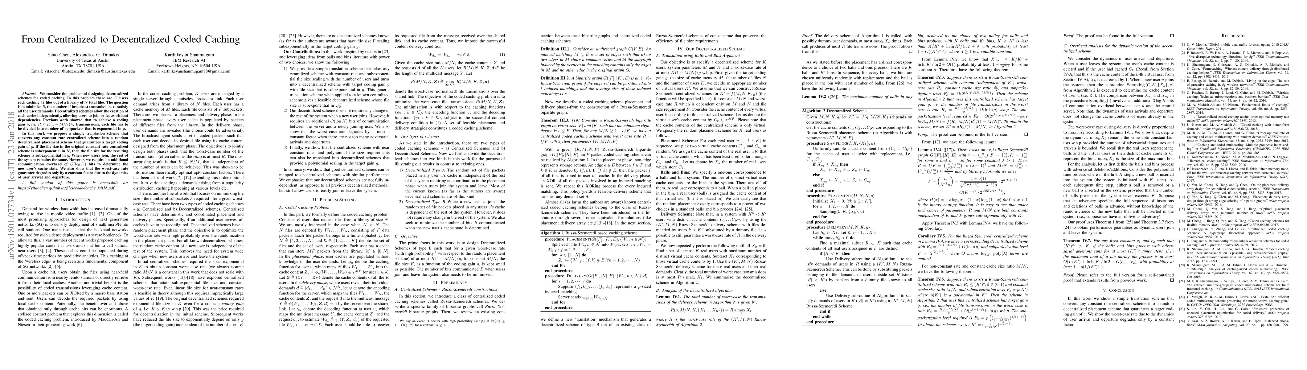 This paper proposes a translation scheme to convert centralized coded caching into decentralized schemes, ensuring a target coding gain while maintaining subexponential file size. It introduces a simple method to adapt existing centralized schemes to dynamically accommodate new users with minimal additional communication overhead.