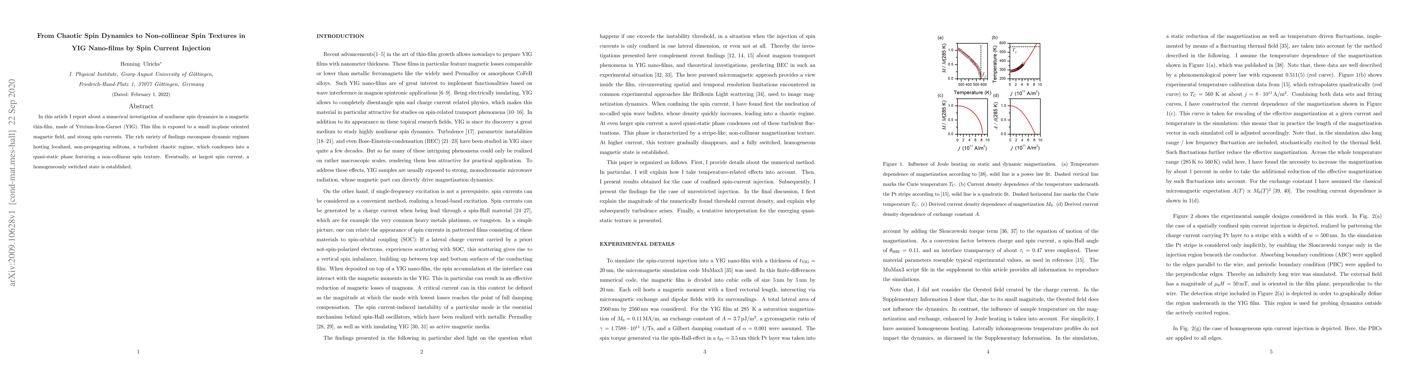 This paper investigates nonlinear spin dynamics in Yttrium-Iron-Garnet (YIG) nano-films under spin current injection and in-plane magnetic fields, revealing chaotic spin dynamics transitioning to non-collinear spin textures and eventually a homogeneously switched state.