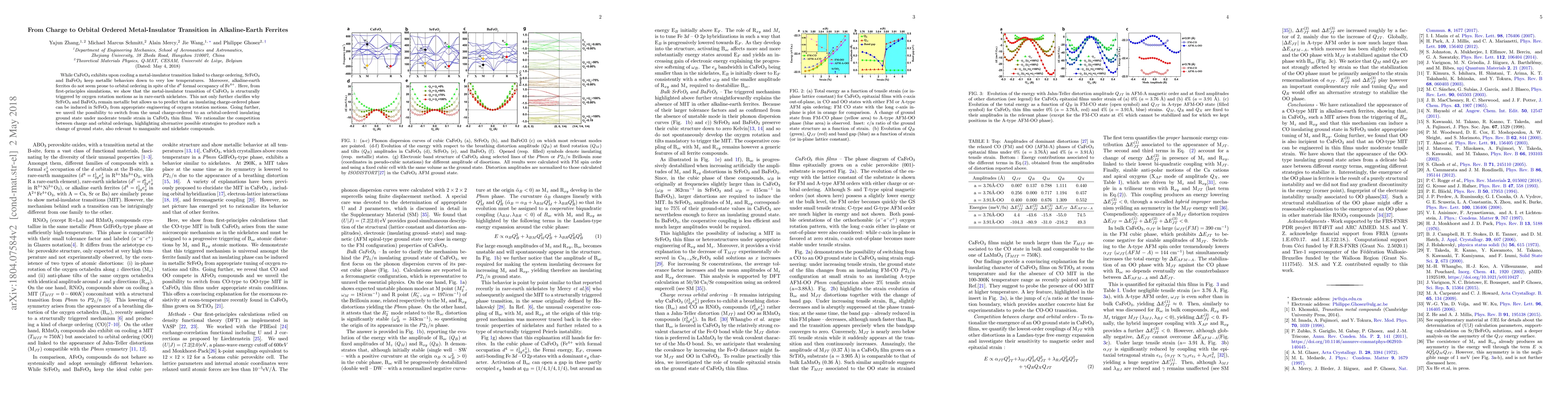 This paper investigates the metal-insulator transition in alkaline-earth ferrites, showing that CaFeO$_3$ undergoes a charge-ordered transition due to structural oxygen rotations, unlike SrFeO$_3$ and BaFeO$_3$ which remain metallic. It predicts that SrFeO$_3$ can be engineered to exhibit an insulating phase and reveals the potential for inducing orbital ordering in CaFeO$_3$ thin films via tensile strain.