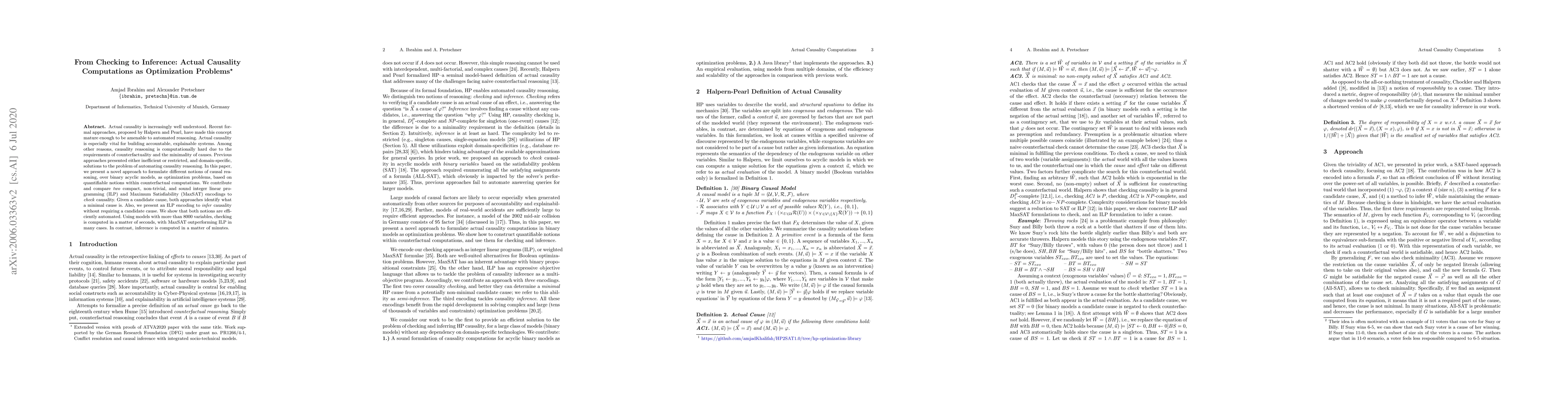 Actual causality is increasingly well understood. Recent formal approaches, proposed by Halpern and Pearl, have made this concept mature enough to be amenable to automated reasoning. Actual causality is especially vital for building accountable, explainable systems. Among other reasons, causality reasoning is computationally hard due to the requirements of counterfactuality and the minimality of causes. Previous approaches presented either inefficient or restricted, and domain-specific, solutions to the problem of automating causality reasoning. In this paper, we present a novel approach to formulate different notions of causal reasoning, over binary acyclic models, as optimization problems, based on quantifiable notions within counterfactual computations. We contribute and compare two compact, non-trivial, and sound integer linear programming (ILP) and Maximum Satisfiability (MaxSAT) encodings to check causality. Given a candidate cause, both approaches identify what a minimal cause is. Also, we present an ILP encoding to infer causality without requiring a candidate cause. We show that both notions are efficiently automated. Using models with more than $8000$ variables, checking is computed in a matter of seconds, with MaxSAT outperforming ILP in many cases. In contrast, inference is computed in a matter of minutes.