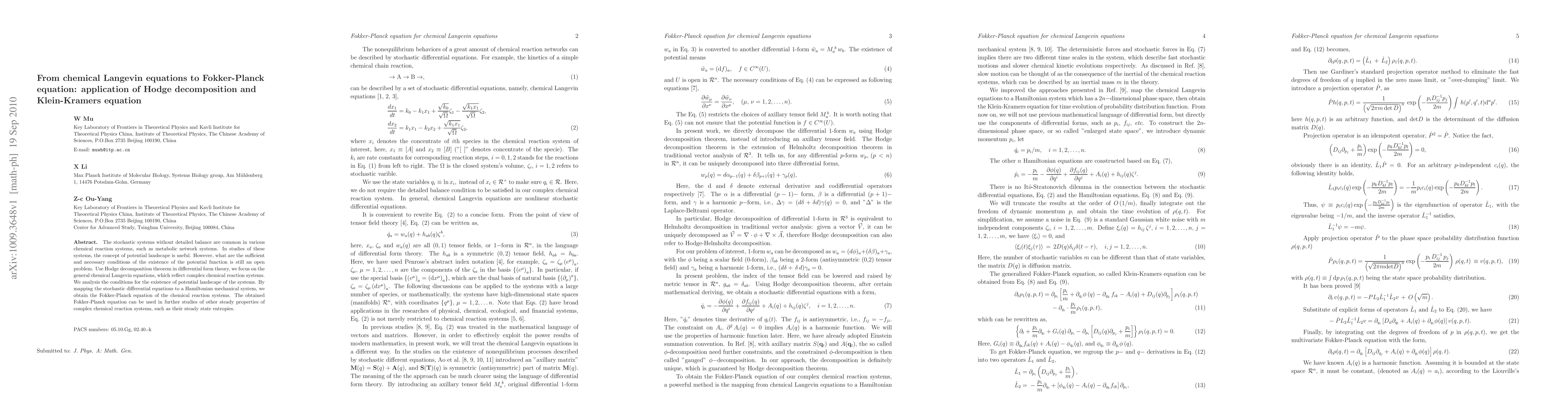 This paper explores the application of Hodge decomposition to derive the Fokker-Planck equation from general chemical Langevin equations, addressing the existence of potential landscapes in stochastic chemical reaction systems. The method facilitates the study of steady-state properties, such as entropy, in complex metabolic networks.