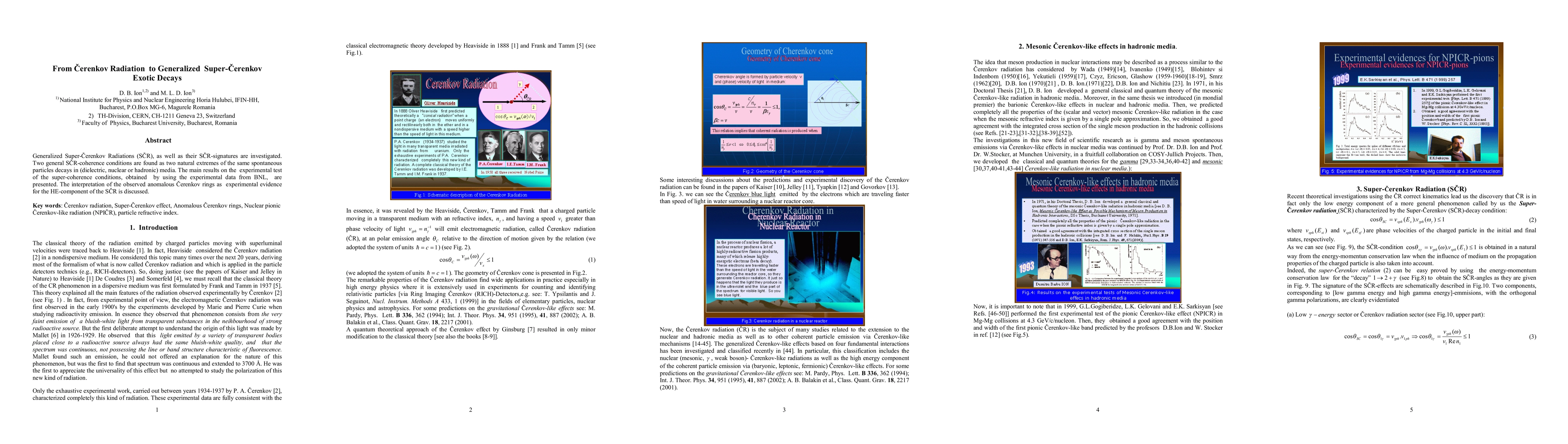 Generalized Super-Cherenkov Radiations (SCR), as well as their SCR-signatures are investigated. Two general SCR-coherence conditions are found as two natural extremes of the same spontaneous particles decays in (dielectric, nuclear or hadronic) media. The main results on the experimental test of the super-coherence conditions, obtained by using the experimental data from BNL, are presented. The interpretation of the observed anomalous Cherenkov rings as experimental evidence for the HE-component of the SCR is discussed.