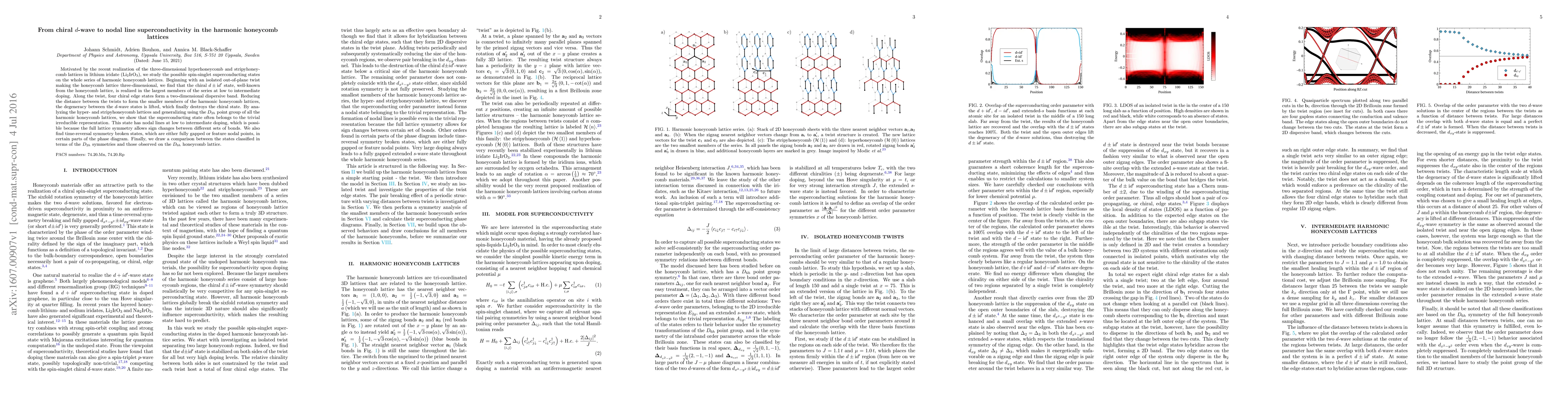 This paper explores superconducting states on harmonic honeycomb lattices, finding that chiral d-wave superconductivity transitions to nodal line superconductivity as the lattice structure changes. The study reveals that lattice symmetry allows for sign changes between bonds, leading to nodal line states and time-reversal symmetry broken states.