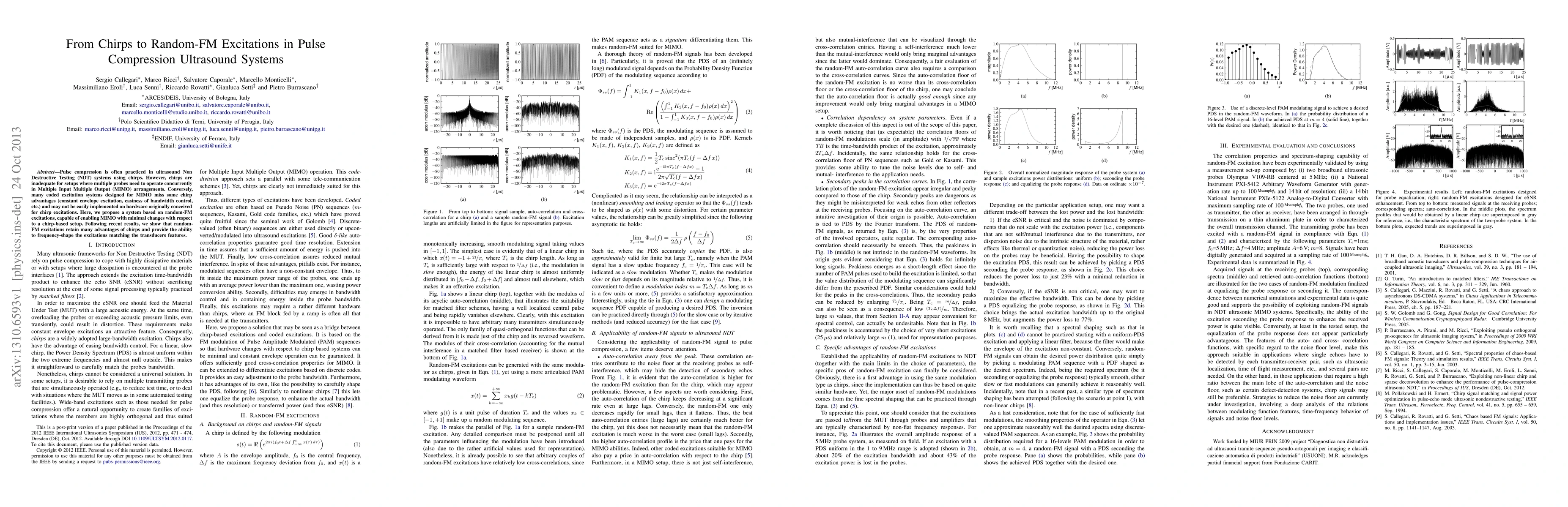 Pulse compression is often practiced in ultrasound Non Destructive Testing (NDT) systems using chirps. However, chirps are inadequate for setups where multiple probes need to operate concurrently in Multiple Input Multiple Output (MIMO) arrangements. Conversely, many coded excitation systems designed for MIMO miss some chirp advantages (constant envelope excitation, easiness of bandwidth control, etc.) and may not be easily implemented on hardware originally conceived for chirp excitations. Here, we propose a system based on random-FM excitations, capable of enabling MIMO with minimal changes with respect to a chirp-based setup. Following recent results, we show that random-FM excitations retain many advantages of chirps and provide the ability to frequency-shape the excitations matching the transducers features.