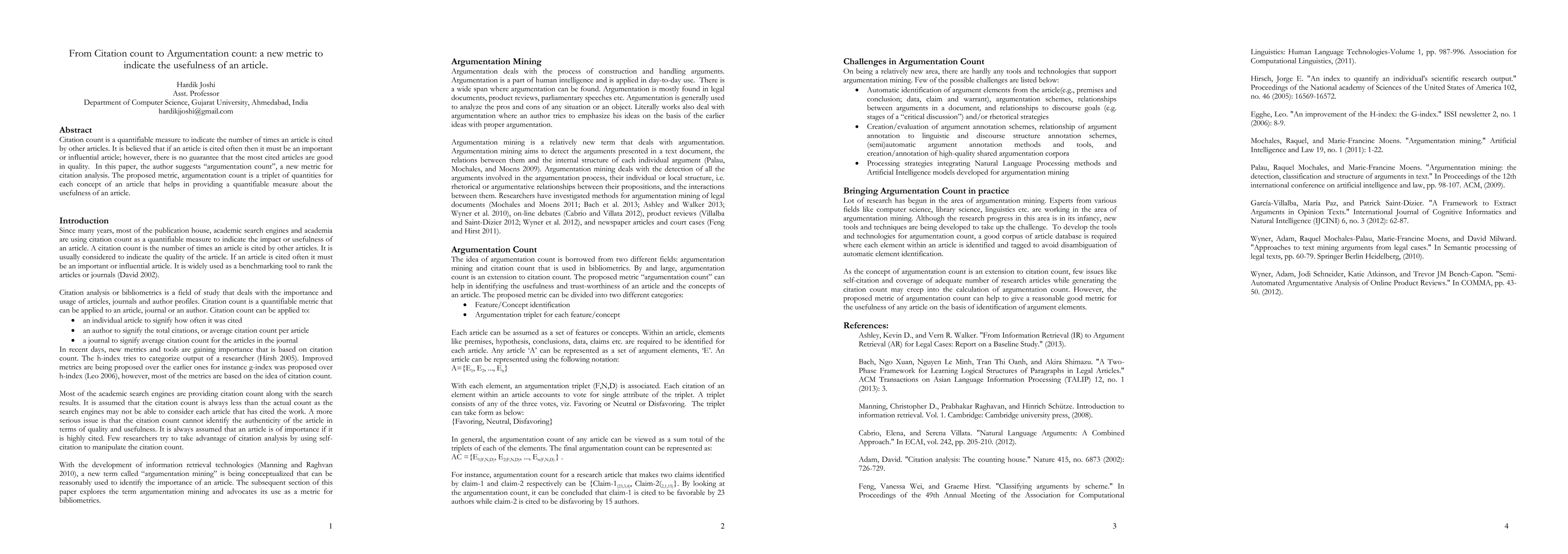 This paper proposes "argumentation count" as a new metric to assess article usefulness, moving beyond traditional citation count. It introduces a triplet of measures for each concept in an article to provide a more reliable indicator of quality and influence.