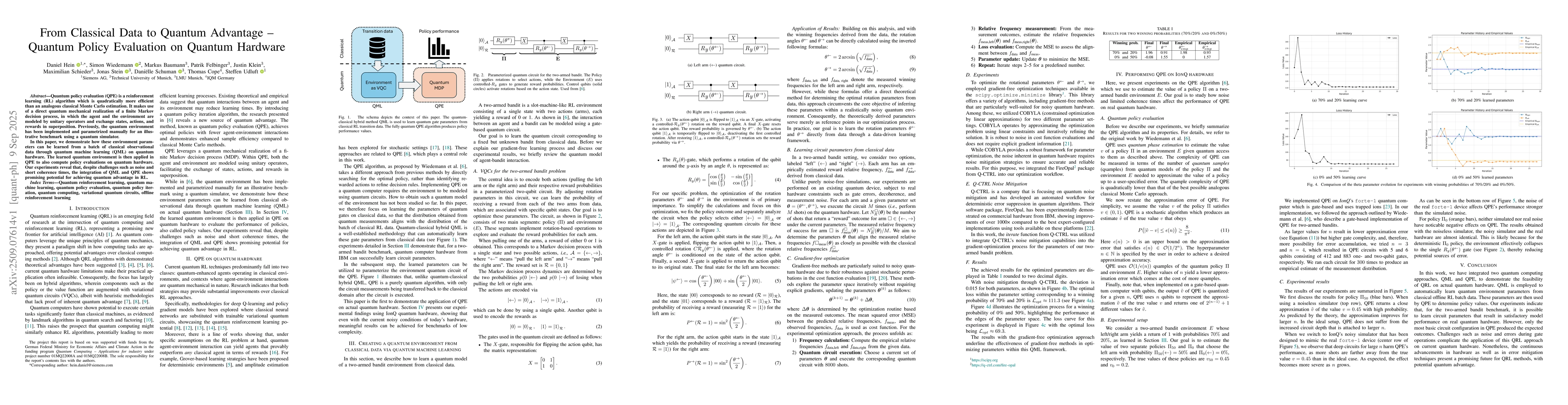 Quantum policy evaluation (QPE) is a reinforcement learning (RL) algorithm which is quadratically more efficient than an analogous classical Monte Carlo estimation. It makes use of a direct quantum mechanical realization of a finite Markov decision process, in which the agent and the environment are modeled by unitary operators and exchange states, actions, and rewards in superposition. Previously, the quantum environment has been implemented and parametrized manually for an illustrative benchmark using a quantum simulator. In this paper, we demonstrate how these environment parameters can be learned from a batch of classical observational data through quantum machine learning (QML) on quantum hardware. The learned quantum environment is then applied in QPE to also compute policy evaluations on quantum hardware. Our experiments reveal that, despite challenges such as noise and short coherence times, the integration of QML and QPE shows promising potential for achieving quantum advantage in RL.