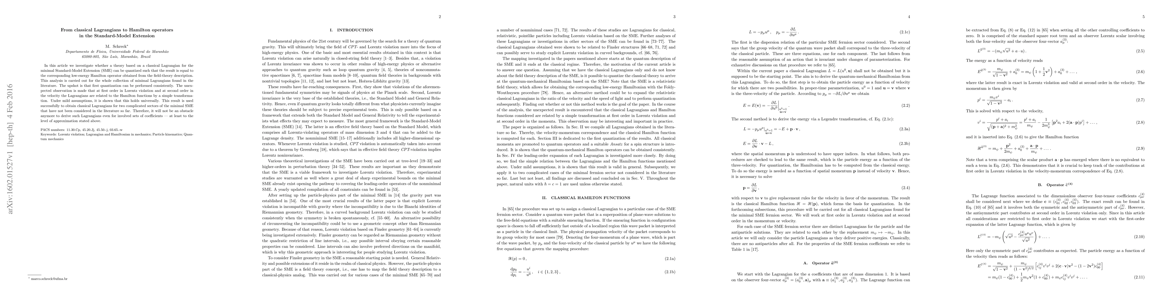 This paper explores the quantization of classical Lagrangians for the minimal Standard-Model Extension (SME) to match the corresponding low-energy Hamilton operators, finding that first quantization is consistent. It reveals a simple transformation relating Lagrangians to Hamilton functions at first order in Lorentz violation and second order in velocity, which holds universally under mild assumptions.
