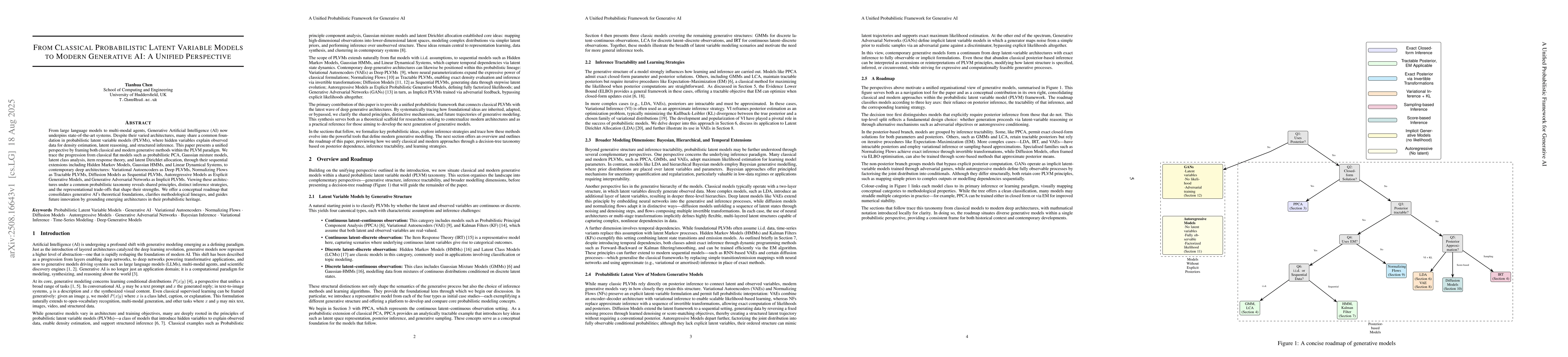 From large language models to multi-modal agents, Generative Artificial Intelligence (AI) now underpins state-of-the-art systems. Despite their varied architectures, many share a common foundation in probabilistic latent variable models (PLVMs), where hidden variables explain observed data for density estimation, latent reasoning, and structured inference. This paper presents a unified perspective by framing both classical and modern generative methods within the PLVM paradigm. We trace the progression from classical flat models such as probabilistic PCA, Gaussian mixture models, latent class analysis, item response theory, and latent Dirichlet allocation, through their sequential extensions including Hidden Markov Models, Gaussian HMMs, and Linear Dynamical Systems, to contemporary deep architectures: Variational Autoencoders as Deep PLVMs, Normalizing Flows as Tractable PLVMs, Diffusion Models as Sequential PLVMs, Autoregressive Models as Explicit Generative Models, and Generative Adversarial Networks as Implicit PLVMs. Viewing these architectures under a common probabilistic taxonomy reveals shared principles, distinct inference strategies, and the representational trade-offs that shape their strengths. We offer a conceptual roadmap that consolidates generative AI's theoretical foundations, clarifies methodological lineages, and guides future innovation by grounding emerging architectures in their probabilistic heritage.