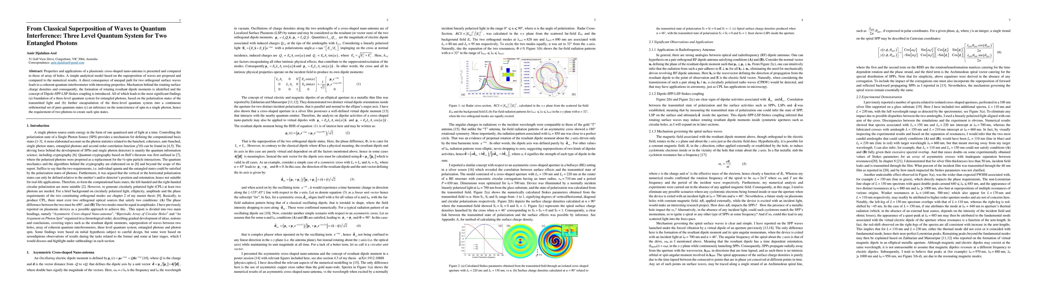 Properties and applications of a plasmonic cross-shaped nano-antenna is presented and compared to those of array of holes. A simple analytical model based on the superposition of waves are proposed and compared to the numerical results. A direct consequence of unequal path for two orthogonal surface waves leads to a coherent quantum interferometer with interesting properties. Mechanism behind the rotating surface charge densities and consequently, the formation of rotating resultant dipole moments is identified and the concept of Dipole-SPP-LSP-Stokes coupling is introduced. All of which leads to the most significant findings (a) foundation of a three-level quantum system for entangled photons, based on the polarization states of the transmitted light and (b) further encapsulation of the three-level quantum system into a continuous orthonormal set of pure quantum states (c) an inference on the nonexistence of spin in a single photon, hence the requirement of two photons to create such spin states.