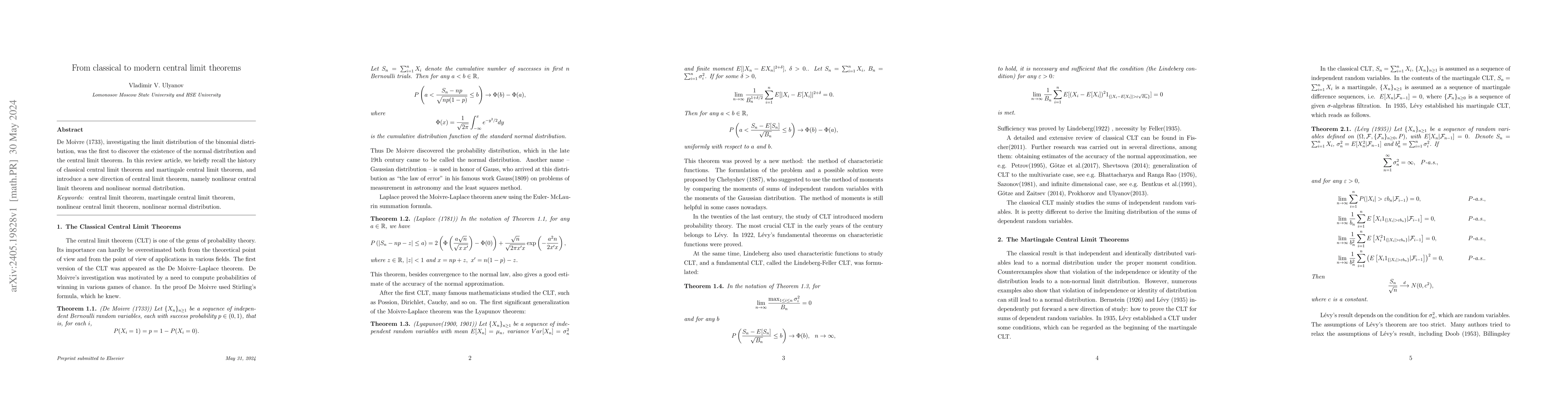 This paper reviews the evolution of the central limit theorem from its classical form discovered by De Moivre in 1733 to modern martingale and nonlinear versions, highlighting the emergence of the normal distribution and its significance in probability theory.