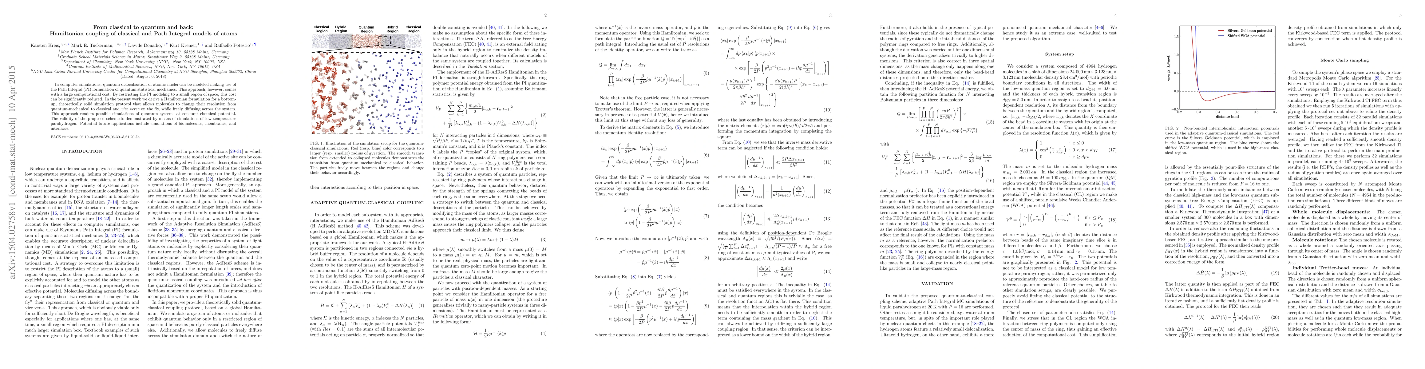 In computer simulations, quantum delocalization of atomic nuclei can be modeled making use of the Path Integral (PI) formulation of quantum statistical mechanics. This approach, however, comes with a large computational cost. By restricting the PI modeling to a small region of space, this cost can be significantly reduced. In the present work we derive a Hamiltonian formulation for a bottom-up, theoretically solid simulation protocol that allows molecules to change their resolution from quantum-mechanical to classical and vice versa on the fly, while freely diffusing across the system. This approach renders possible simulations of quantum systems at constant chemical potential. The validity of the proposed scheme is demonstrated by means of simulations of low temperature parahydrogen. Potential future applications include simulations of biomolecules, membranes, and interfaces.