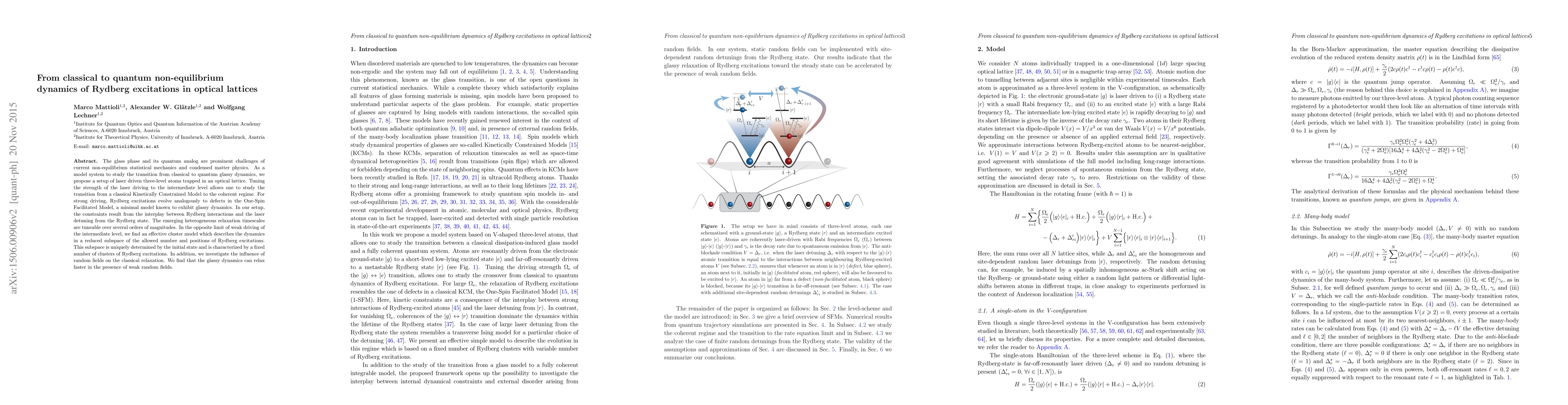 This paper explores the transition from classical to quantum non-equilibrium dynamics in Rydberg excitations within an optical lattice, proposing a laser-driven three-level atom model to study the Kinetically Constrained Model and its quantum analog. It finds that strong laser driving leads to Rydberg excitations evolving similarly to defects in the One-Spin Facilitated Model, while weak driving results in an effective cluster model.