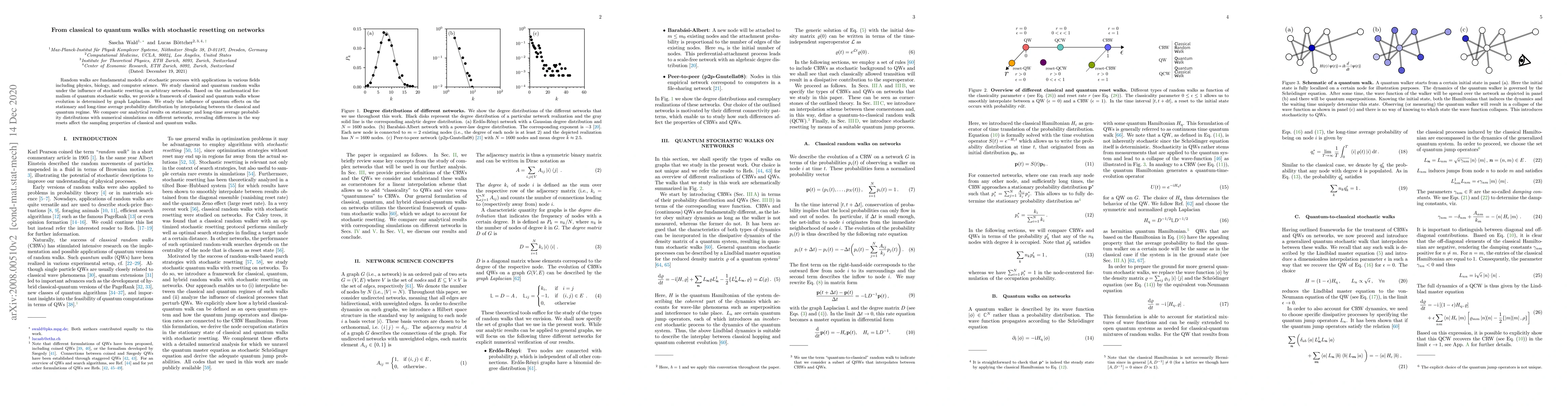 The research introduces a framework for studying classical, quantum, and hybrid random walks with stochastic resetting on networks, deriving analytical solutions for the probability of a classical or quantum random walker occupying a certain node on a network, valid for general reset rates and network structures.