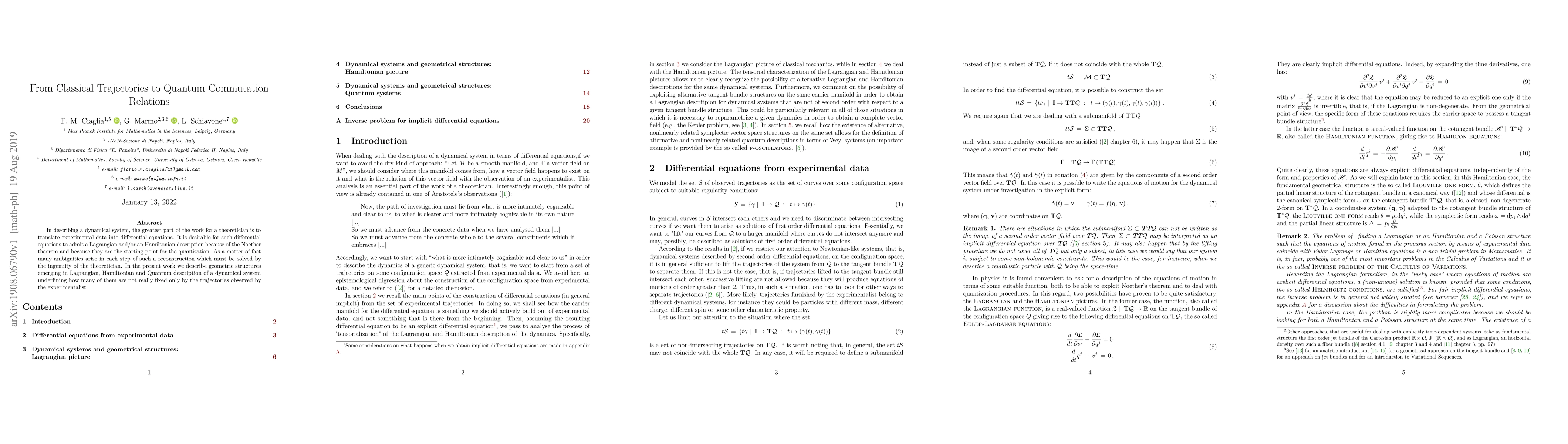 In describing a dynamical system, the greatest part of the work for a theoretician is to translate experimental data into differential equations. It is desirable for such differential equations to admit a Lagrangian and/or an Hamiltonian description because of the Noether theorem and because they are the starting point for the quantization. As a matter of fact many ambiguities arise in each step of such a reconstruction which must be solved by the ingenuity of the theoretician. In the present work we describe geometric structures emerging in Lagrangian, Hamiltonian and Quantum description of a dynamical system underlining how many of them are not really fixed only by the trajectories observed by the experimentalist.