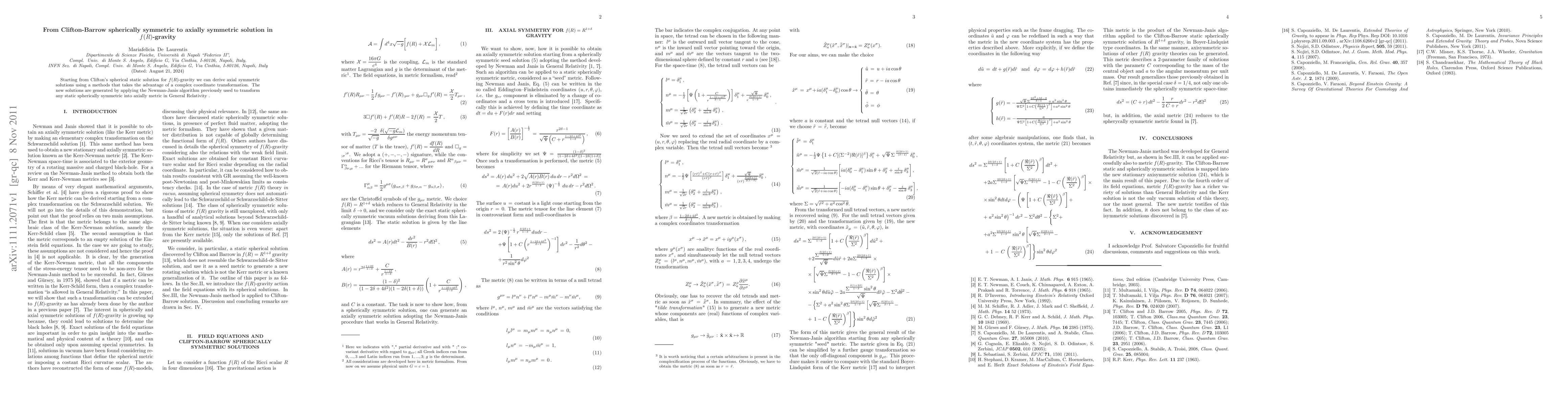 Starting from Clifton's spherical static solution for f(R)-gravity we can derive axial symmetric solutions using a methods that takes the advantage of a complex coordinate transformation. The new solutions are generated by applying the Newman-Janis algorithm previously used to transform any static spherically symmetric into axially metric in General Relativity