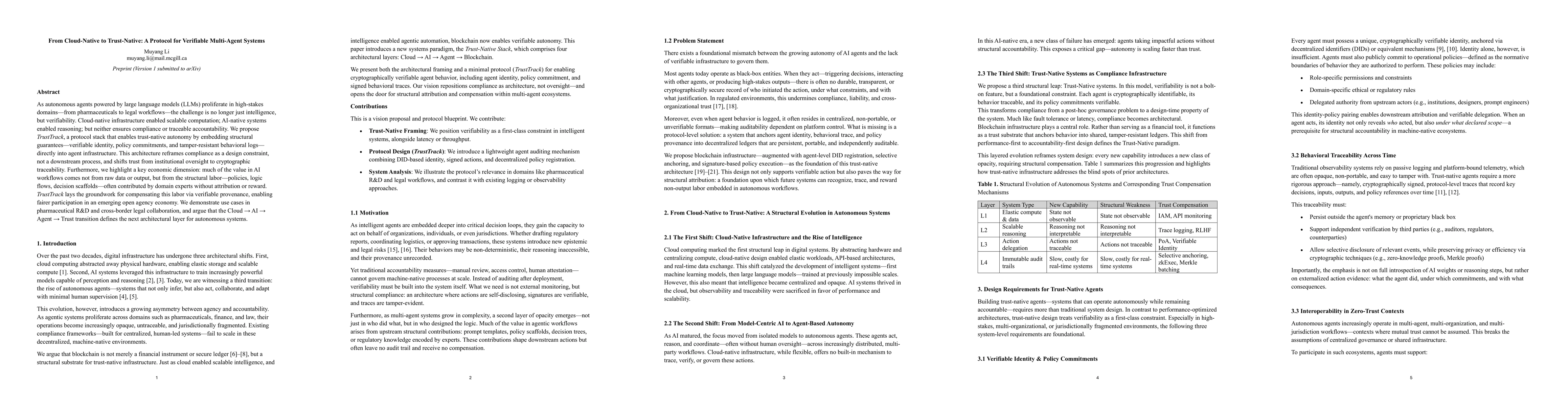 As autonomous agents powered by large language models (LLMs) proliferate in high-stakes domains -- from pharmaceuticals to legal workflows -- the challenge is no longer just intelligence, but verifiability. We introduce TrustTrack, a protocol that embeds structural guarantees -- verifiable identity, policy commitments, and tamper-resistant behavioral logs -- directly into agent infrastructure. This enables a new systems paradigm: trust-native autonomy. By treating compliance as a design constraint rather than post-hoc oversight, TrustTrack reframes how intelligent agents operate across organizations and jurisdictions. We present the protocol design, system requirements, and use cases in regulated domains such as pharmaceutical R&D, legal automation, and AI-native collaboration. We argue that the Cloud -> AI -> Agent -> Trust transition represents the next architectural layer for autonomous systems.