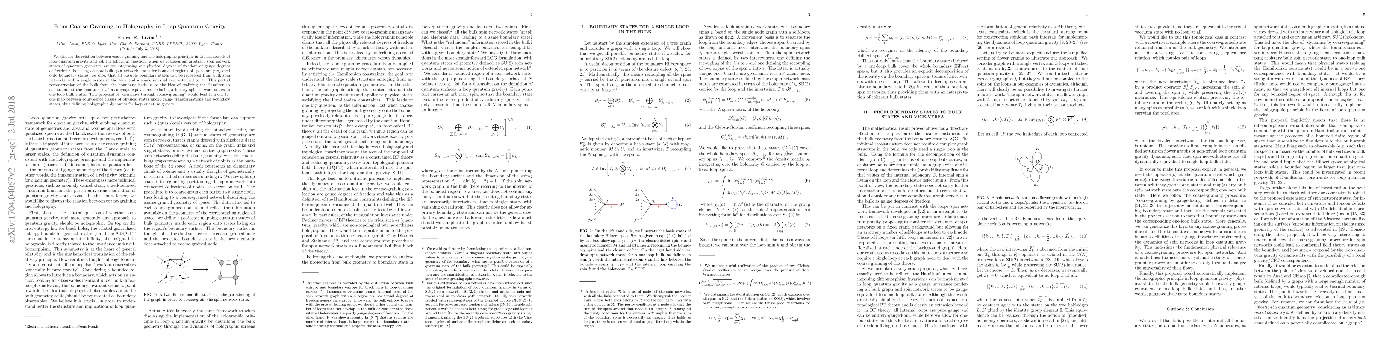 This paper explores the relationship between coarse-graining and holography within loop quantum gravity, proposing that coarse-graining spin network states may reduce them to one-loop bulk states, reflecting gauge equivalence and enabling a one-to-one mapping between physical states and boundary states, thereby establishing holographic dynamics.