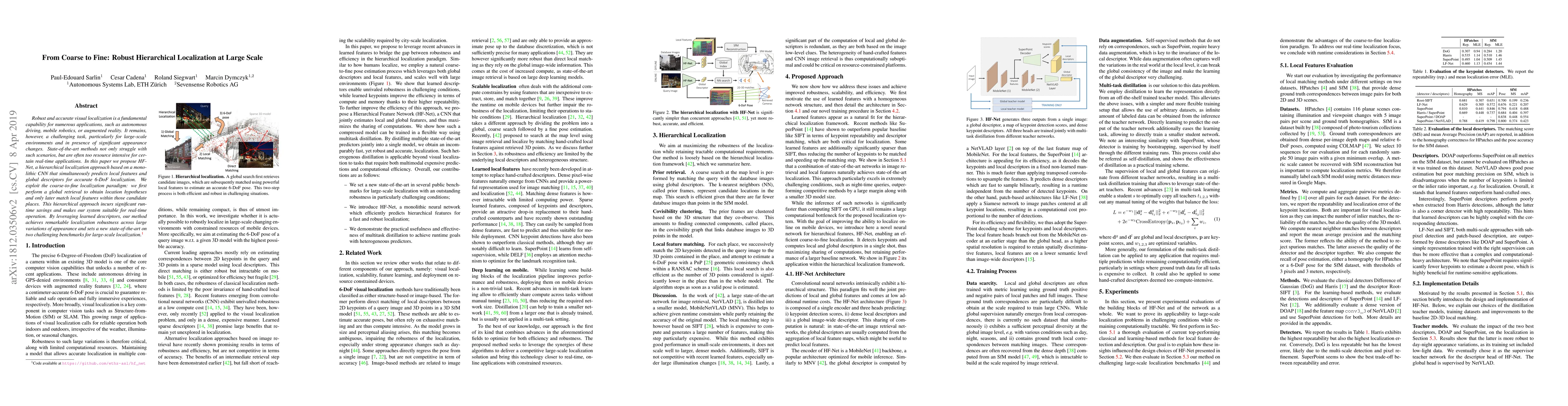 This paper introduces HF-Net, a hierarchical localization method using a monolithic CNN to predict local features and global descriptors for robust 6-DoF localization. It employs a coarse-to-fine strategy, achieving significant runtime savings and state-of-the-art performance on large-scale localization benchmarks.