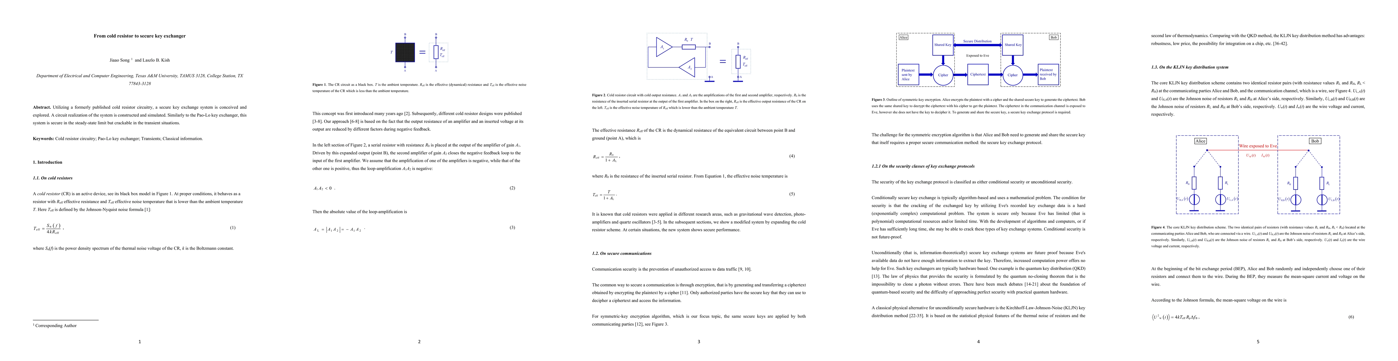 Utilizing a formerly published cold resistor circuitry, a secure key exchange system is conceived and explored. A circuit realization of the system is constructed and simulated. Similarly to the Pao-Lo key exchanger, this system is secure in the steady-state limit but crackable in the transient situations.