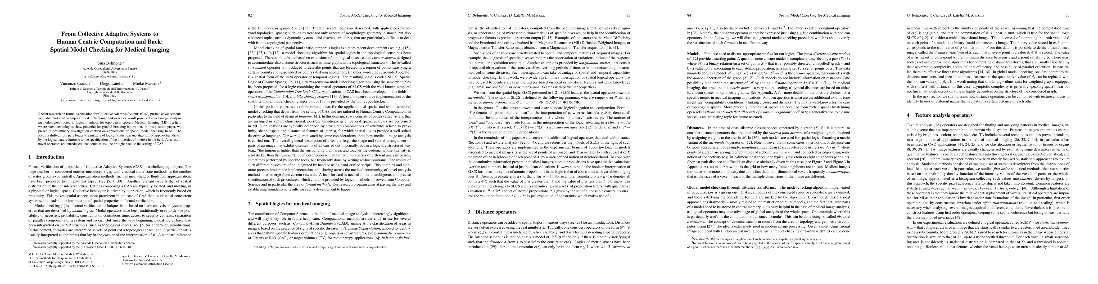 This paper explores the application of spatial model checking, originally developed for Collective Adaptive Systems, to Medical Imaging. It combines logical, statistical, and algorithmic methods to analyze medical images, introducing new operators that may also benefit the CAS domain.