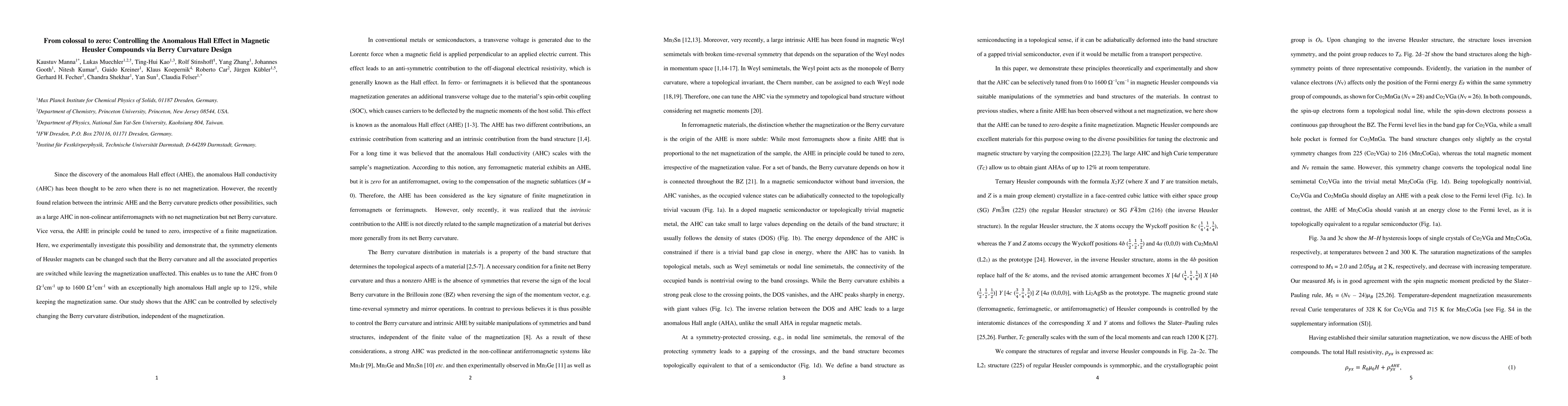 This research demonstrates that the anomalous Hall effect in magnetic Heusler compounds can be controlled by manipulating the Berry curvature, allowing the anomalous Hall conductivity to be tuned from 0 to 1600 Ω^-1cm^-1 without altering the magnetization, showcasing a high anomalous Hall angle of up to 12%.
