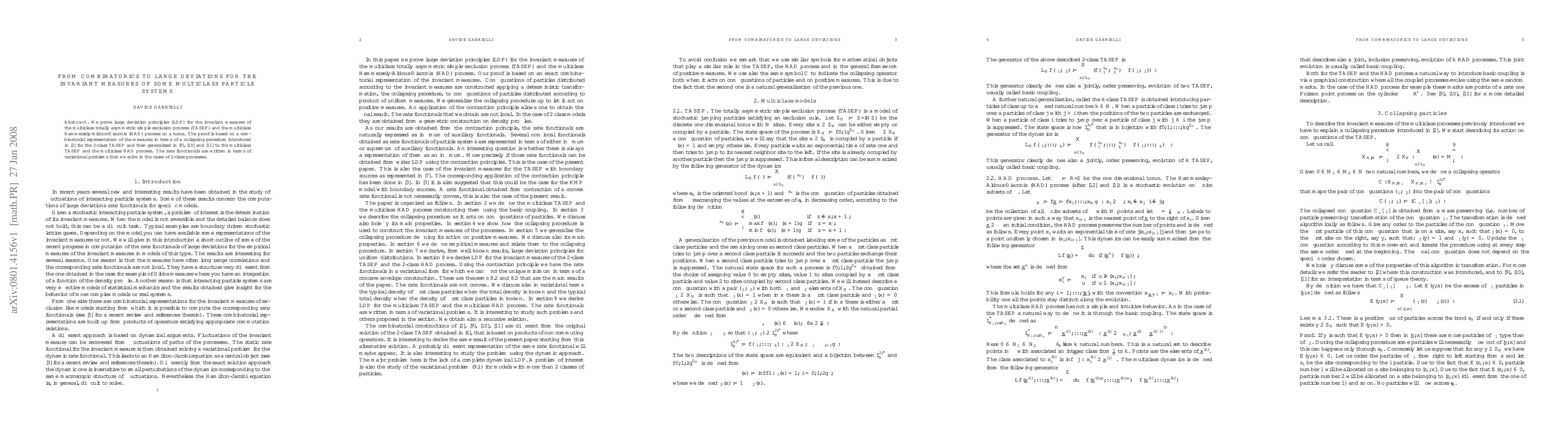 This research establishes large deviation principles for the invariant measures of multiclass TASEP and HAD processes on a torus, using a combinatorial representation via a collapsing procedure. The rate functionals are expressed as variational problems, solved for 2-class processes.