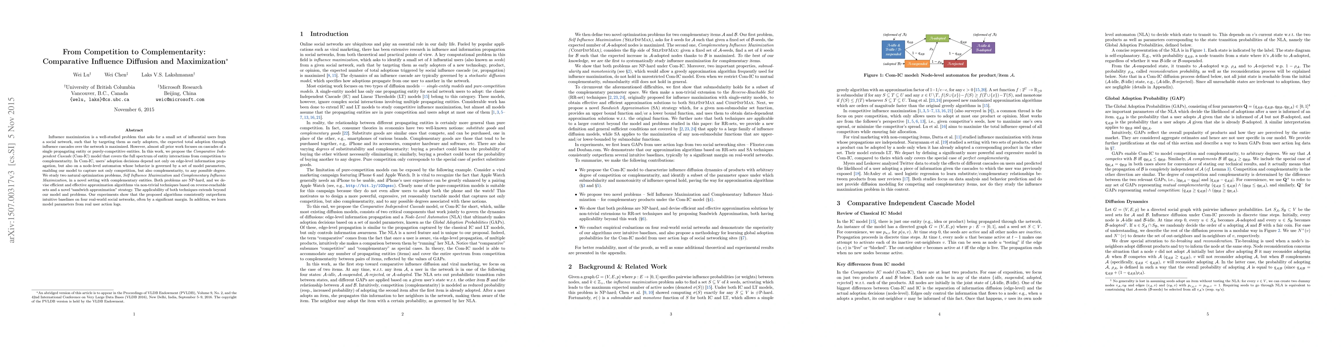 This paper introduces the Comparative Independent Cascade (Com-IC) model to capture both competitive and complementary interactions in influence diffusion across social networks. It proposes efficient algorithms for Self Influence Maximization and Complementary Influence Maximization, demonstrating their effectiveness through experiments on real-world social networks.