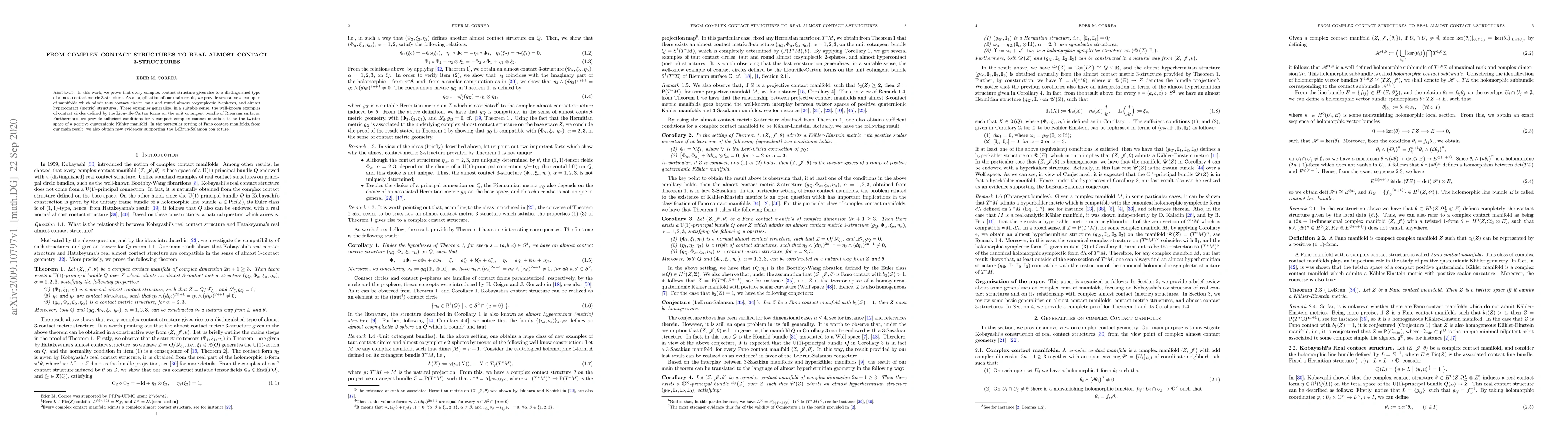 In this work, we prove that every complex contact structure gives rise to a distinguished type of almost contact metric 3-structure. As an application of our main result, we provide several new examples of manifolds which admit taut contact circles, taut and round almost cosymplectic 2-spheres, and almost hypercontact (metric) structures. These examples generalize, in a suitable sense, the well-known examples of contact circles defined by the Liouville-Cartan forms on the unit cotangent bundle of Riemann surfaces. Furthermore, we provide sufficient conditions for a compact complex contact manifold to be the twistor space of a positive quaternionic K\"{a}hler manifold. In the particular setting of Fano contact manifolds, from our main result, we also obtain new evidences supporting the LeBrun-Salamon conjecture.