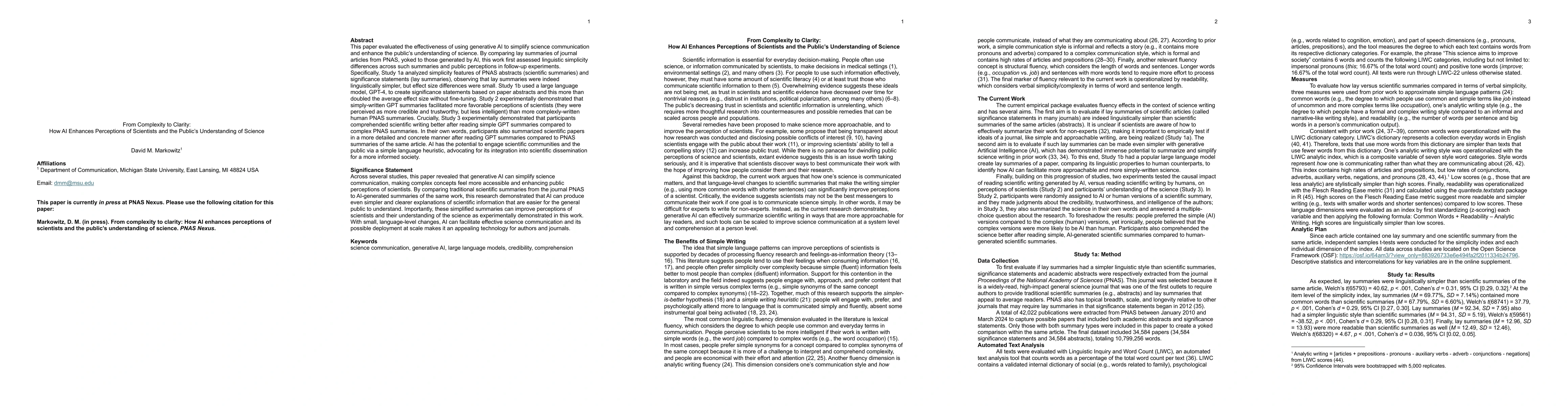 This study evaluates how generative AI can simplify science communication, finding that AI-generated summaries enhance public understanding and perception of scientists. Simpler AI summaries improved comprehension and led to more favorable views of scientists compared to complex human summaries.