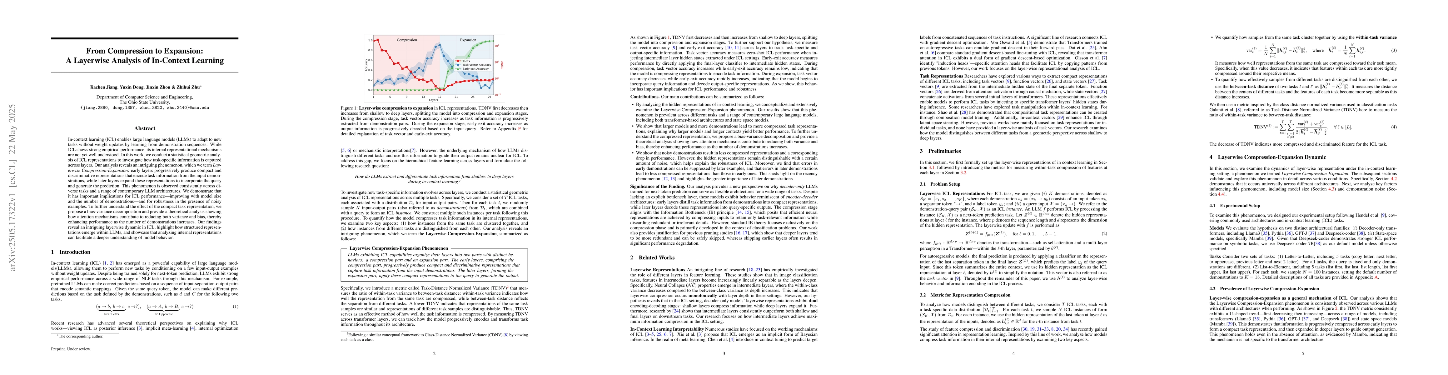 In-context learning (ICL) enables large language models (LLMs) to adapt to new tasks without weight updates by learning from demonstration sequences. While ICL shows strong empirical performance, its internal representational mechanisms are not yet well understood. In this work, we conduct a statistical geometric analysis of ICL representations to investigate how task-specific information is captured across layers. Our analysis reveals an intriguing phenomenon, which we term *Layerwise Compression-Expansion*: early layers progressively produce compact and discriminative representations that encode task information from the input demonstrations, while later layers expand these representations to incorporate the query and generate the prediction. This phenomenon is observed consistently across diverse tasks and a range of contemporary LLM architectures. We demonstrate that it has important implications for ICL performance -- improving with model size and the number of demonstrations -- and for robustness in the presence of noisy examples. To further understand the effect of the compact task representation, we propose a bias-variance decomposition and provide a theoretical analysis showing how attention mechanisms contribute to reducing both variance and bias, thereby enhancing performance as the number of demonstrations increases. Our findings reveal an intriguing layerwise dynamic in ICL, highlight how structured representations emerge within LLMs, and showcase that analyzing internal representations can facilitate a deeper understanding of model behavior.