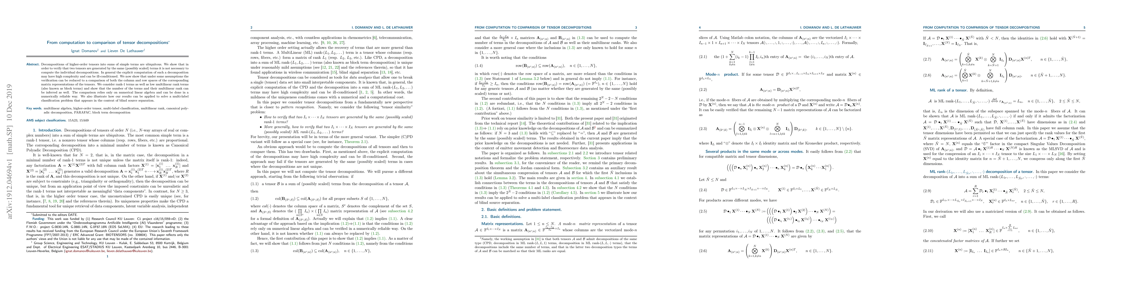 Researchers developed a method to verify if two tensors have the same decomposition without explicitly computing it, using comparison of matrix representations' column and row spaces instead.