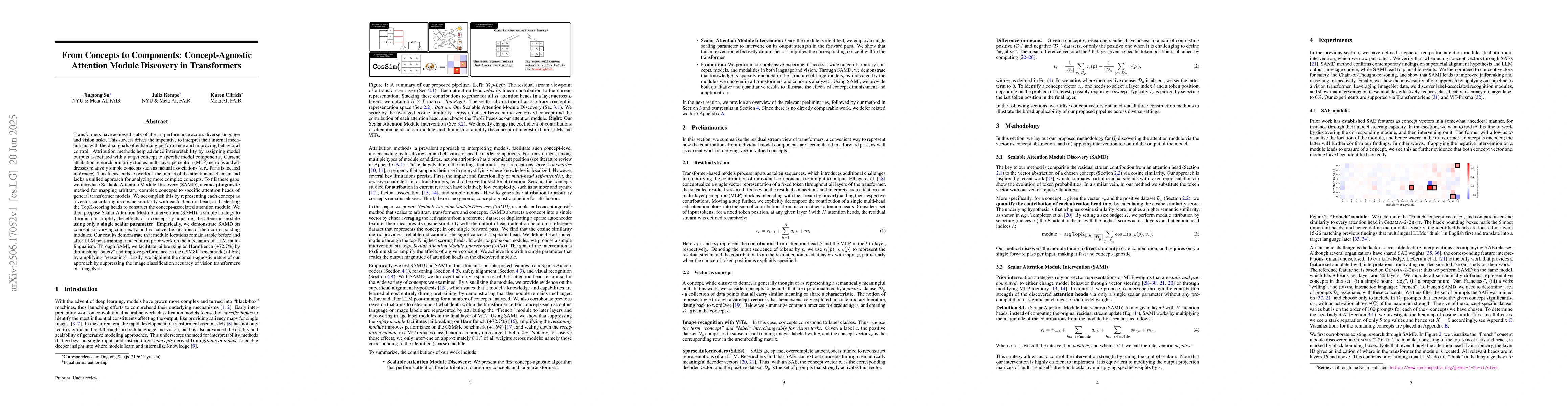 Transformers have achieved state-of-the-art performance across language and vision tasks. This success drives the imperative to interpret their internal mechanisms with the dual goals of enhancing performance and improving behavioral control. Attribution methods help advance interpretability by assigning model outputs associated with a target concept to specific model components. Current attribution research primarily studies multi-layer perceptron neurons and addresses relatively simple concepts such as factual associations (e.g., Paris is located in France). This focus tends to overlook the impact of the attention mechanism and lacks a unified approach for analyzing more complex concepts. To fill these gaps, we introduce Scalable Attention Module Discovery (SAMD), a concept-agnostic method for mapping arbitrary, complex concepts to specific attention heads of general transformer models. We accomplish this by representing each concept as a vector, calculating its cosine similarity with each attention head, and selecting the TopK-scoring heads to construct the concept-associated attention module. We then propose Scalar Attention Module Intervention (SAMI), a simple strategy to diminish or amplify the effects of a concept by adjusting the attention module using only a single scalar parameter. Empirically, we demonstrate SAMD on concepts of varying complexity, and visualize the locations of their corresponding modules. Our results demonstrate that module locations remain stable before and after LLM post-training, and confirm prior work on the mechanics of LLM multilingualism. Through SAMI, we facilitate jailbreaking on HarmBench (+72.7%) by diminishing "safety" and improve performance on the GSM8K benchmark (+1.6%) by amplifying "reasoning". Lastly, we highlight the domain-agnostic nature of our approach by suppressing the image classification accuracy of vision transformers on ImageNet.