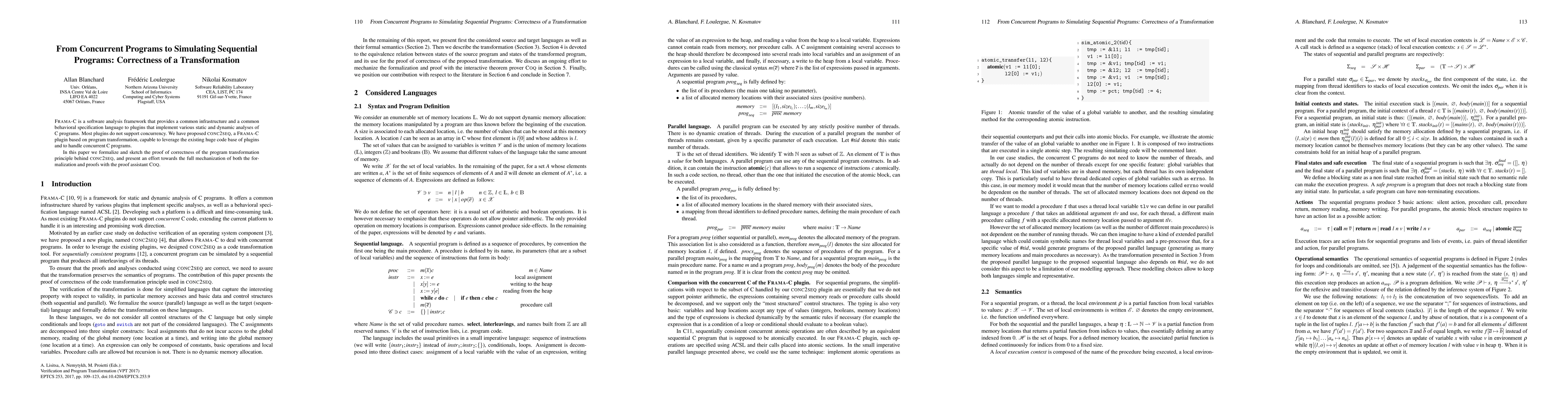 This paper presents Conc2Seq, a Frama-C plugin that transforms concurrent C programs into sequential form using program transformation, enabling existing analysis plugins to handle concurrent code. It formalizes and outlines the proof of correctness for this transformation, aiming for full mechanization using Coq.