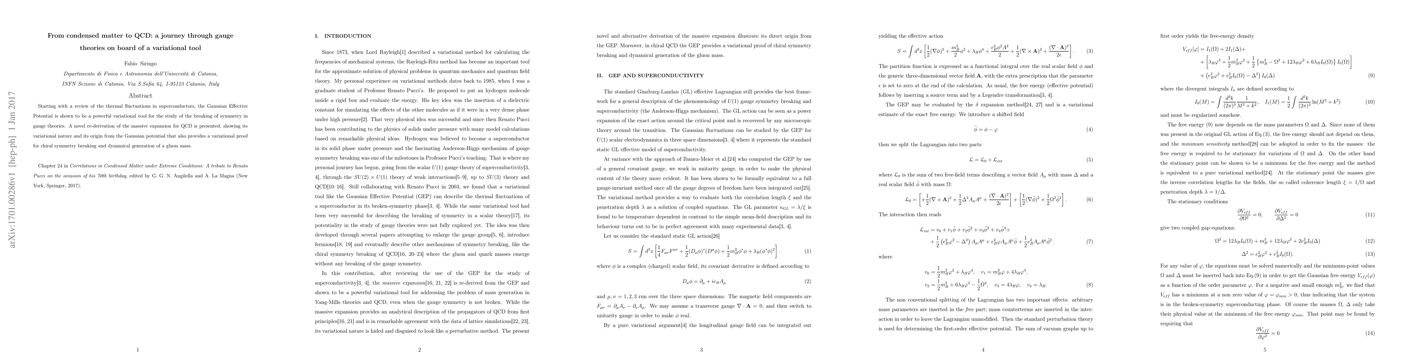 Starting with a review of the thermal fluctuations in superconductors, the Gaussian Effective Potential is shown to be a powerful variational tool for the study of the breaking of symmetry in gauge theories. A novel re-derivation of the massive expansion for QCD is presented, showing its variational nature and its origin from the Gaussian potential that also provides a variational proof for chiral symmetry breaking and dynamical generation of a gluon mass.