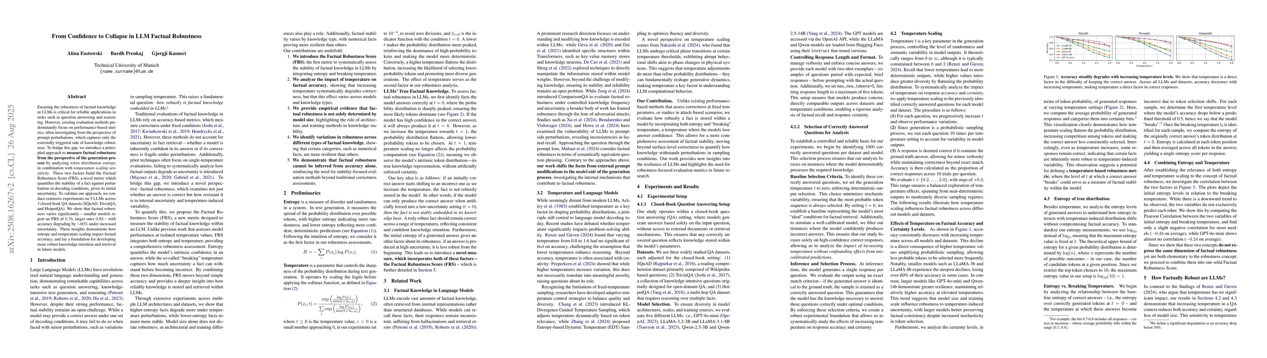 Ensuring the robustness of factual knowledge in LLMs is critical for reliable applications in tasks such as question answering and reasoning. However, existing evaluation methods predominantly focus on performance-based metrics, often investigating from the perspective of prompt perturbations, which captures only the externally triggered side of knowledge robustness. To bridge this gap, we introduce a principled approach to measure factual robustness from the perspective of the generation process by analyzing token distribution entropy in combination with temperature scaling sensitivity. These two factors build the Factual Robustness Score (FRS), a novel metric which quantifies the stability of a fact against perturbations in decoding conditions, given its initial uncertainty. To validate our approach, we conduct extensive experiments on 5 LLMs across 3 closed-book QA datasets (SQuAD, TriviaQA, and HotpotQA). We show that factual robustness varies significantly -- smaller models report an FRS of $0.76$, larger ones $0.93$ -- with accuracy degrading by ~$60\%$ under increased uncertainty. These insights demonstrate how entropy and temperature scaling impact factual accuracy, and lay a foundation for developing more robust knowledge retention and retrieval in future models.
