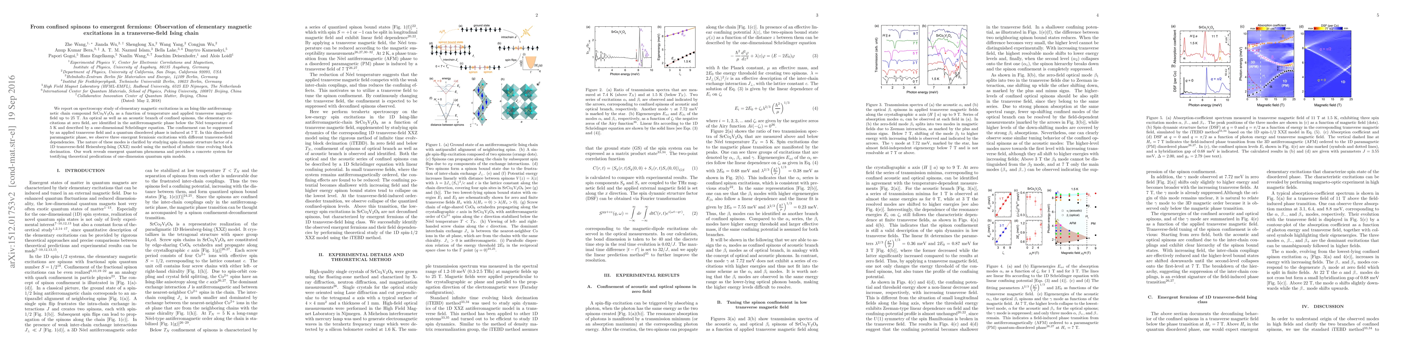 We report on spectroscopy study of elementary magnetic excitations in an Ising-like antiferromagnetic chain compound SrCo$_2$V$_2$O$_8$ as a function of temperature and applied transverse magnetic field up to 25 T. An optical as well as an acoustic branch of confined spinons, the elementary excitations at zero field, are identified in the antiferromagnetic phase below the N\'{e}el temperature of 5 K and described by a one-dimensional Schr\"{o}dinger equation. The confinement can be suppressed by an applied transverse field and a quantum disordered phase is induced at 7 T. In this disordered paramagnetic phase, we observe three emergent fermionic excitations with different transverse-field dependencies. The nature of these modes is clarified by studying spin dynamic structure factor of a 1D transverse-field Heisenberg-Ising (XXZ) model using the method of infinite time evolving block decimation. Our work reveals emergent quantum phenomena and provides a concrete system for testifying theoretical predications of one-dimension quantum spin models.