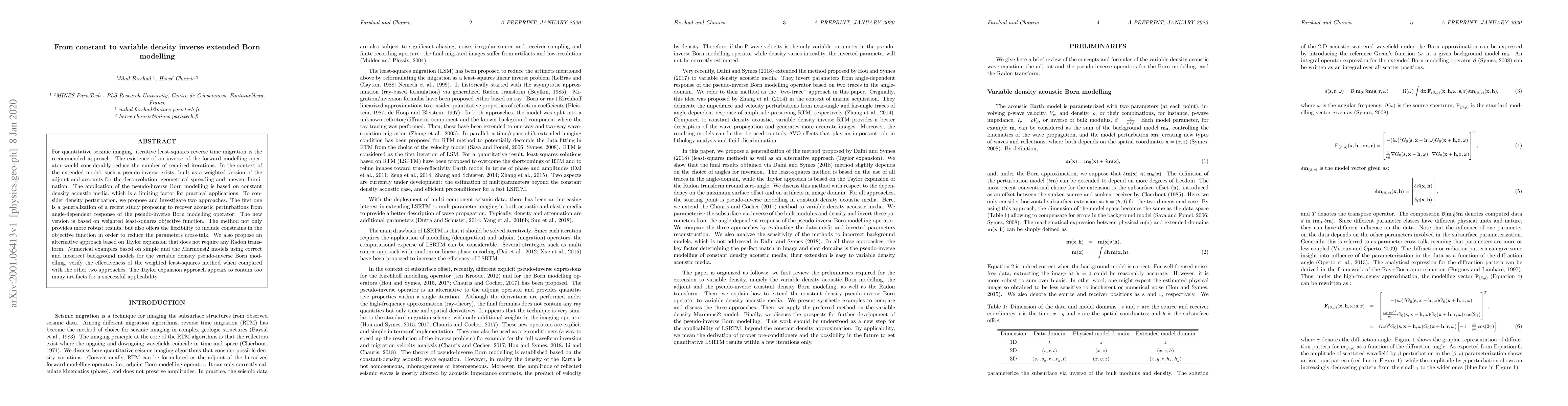 For quantitative seismic imaging, iterative least-squares reverse time migration is the recommended approach. The existence of an inverse of the forward modelling operator would considerably reduce the number of required iterations. In the context of the extended model, such a pseudo-inverse exists, built as a weighted version of the adjoint and accounts for the deconvolution, geometrical spreading and uneven illumination. The application of the pseudo-inverse Born modelling is based on constant density acoustic media, which is a limiting factor for practical applications. To consider density perturbation, we propose and investigate two approaches. The first one is a generalization of a recent study proposing to recover acoustic perturbations from angle-dependent response of the pseudo-inverse Born modelling operator. The new version is based on weighted least-squares objective function. The method not only provides more robust results, but also offers the flexibility to include constrains in the objective function in order to reduce the parameters cross-talk. We also propose an alternative approach based on Taylor expansion that does not require any Radon transform. Numerical examples based on simple and the Marmousi2 models using correct and incorrect background models for the variable density Born modelling, verify the effectiveness of the weighted least-squares method when compared with the other two approaches. The Taylor expansion approach appears to contain too many artifacts for a successful applicability.