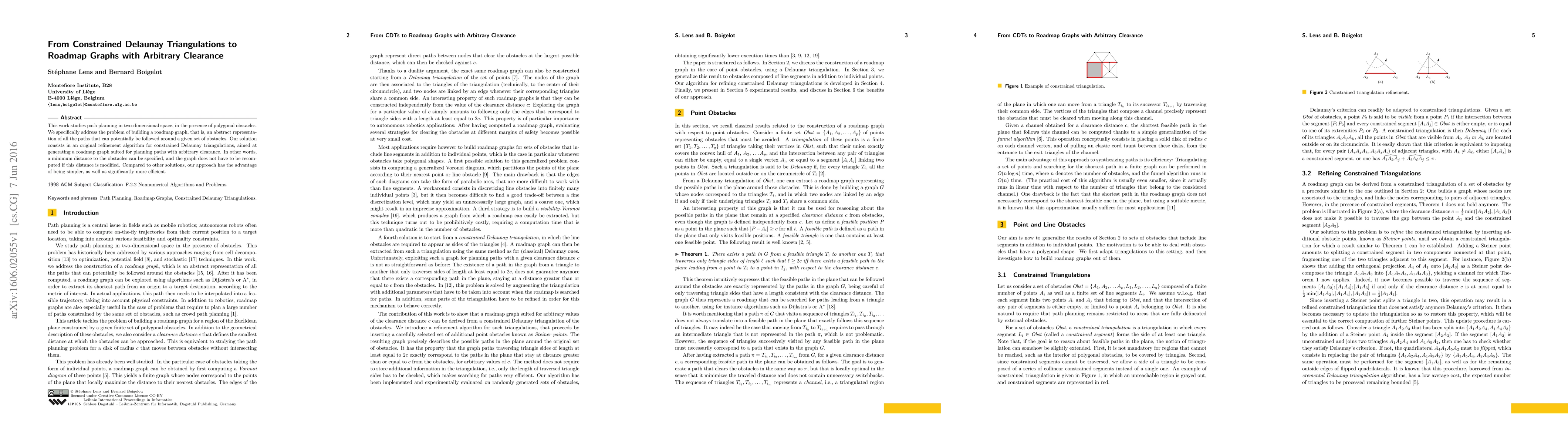 This work studies path planning in two-dimensional space, in the presence of polygonal obstacles. We specifically address the problem of building a roadmap graph, that is, an abstract representation of all the paths that can potentially be followed around a given set of obstacles. Our solution consists in an original refinement algorithm for constrained Delaunay triangulations, aimed at generating a roadmap graph suited for planning paths with arbitrary clearance. In other words, a minimum distance to the obstacles can be specified, and the graph does not have to be recomputed if this distance is modified. Compared to other solutions, our approach has the advantage of being simpler, as well as significantly more efficient.