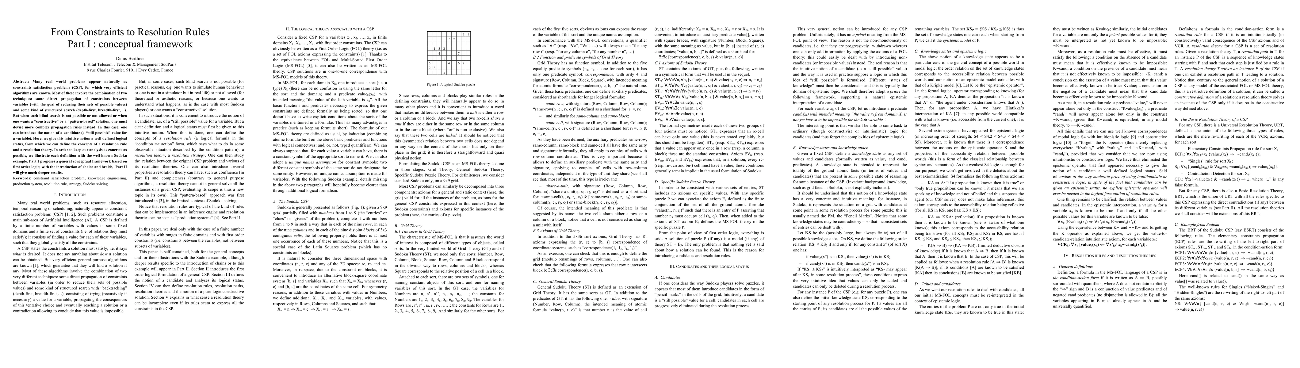 Many real world problems naturally appear as constraints satisfaction problems (CSP), for which very efficient algorithms are known. Most of these involve the combination of two techniques: some direct propagation of constraints between variables (with the goal of reducing their sets of possible values) and some kind of structured search (depth-first, breadth-first,...). But when such blind search is not possible or not allowed or when one wants a 'constructive' or a 'pattern-based' solution, one must devise more complex propagation rules instead. In this case, one can introduce the notion of a candidate (a 'still possible' value for a variable). Here, we give this intuitive notion a well defined logical status, from which we can define the concepts of a resolution rule and a resolution theory. In order to keep our analysis as concrete as possible, we illustrate each definition with the well known Sudoku example. Part I proposes a general conceptual framework based on first order logic; with the introduction of chains and braids, Part II will give much deeper results.
