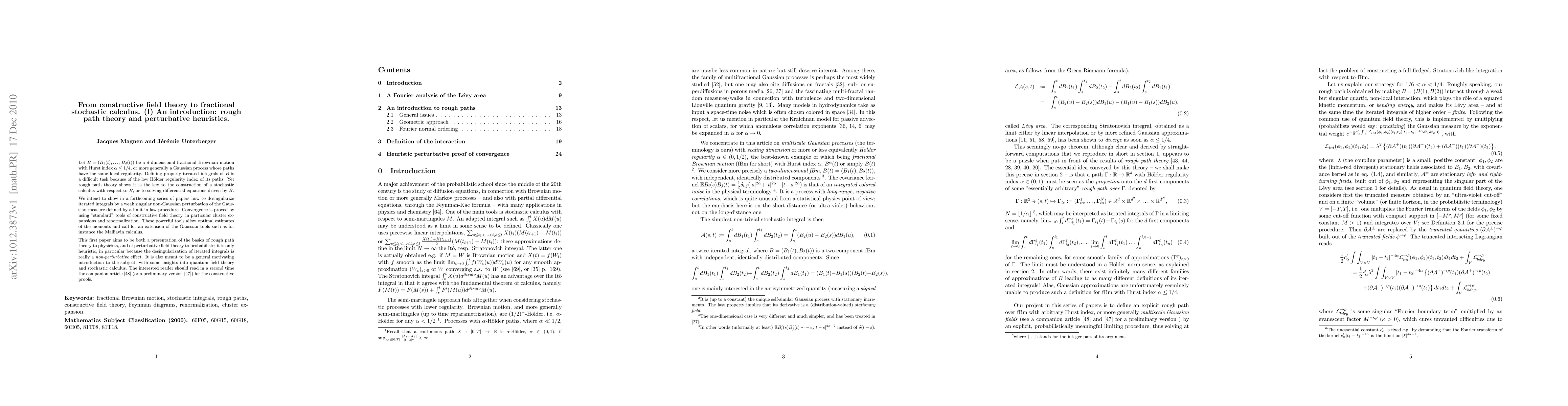 Let $B=(B_1(t),..,B_d(t))$ be a $d$-dimensional fractional Brownian motion with Hurst index $\alpha\le 1/4$, or more generally a Gaussian process whose paths have the same local regularity. Defining properly iterated integrals of $B$ is a difficult task because of the low H\"older regularity index of its paths. Yet rough path theory shows it is the key to the construction of a stochastic calculus with respect to $B$, or to solving differential equations driven by $B$. We intend to show in a forthcoming series of papers how to desingularize iterated integrals by a weak singular non-Gaussian perturbation of the Gaussian measure defined by a limit in law procedure. Convergence is proved by using "standard" tools of constructive field theory, in particular cluster expansions and renormalization. These powerful tools allow optimal estimates of the moments and call for an extension of the Gaussian tools such as for instance the Malliavin calculus. This first paper aims to be both a presentation of the basics of rough path theory to physicists, and of perturbative field theory to probabilists; it is only heuristic, in particular because the desingularization of iterated integrals is really a {\em non-perturbative} effect. It is also meant to be a general motivating introduction to the subject, with some insights into quantum field theory and stochastic calculus. The interested reader should read in a second time the companion article \cite{MagUnt2} (or a preliminary version arXiv:1006.1255) for the constructive proofs.