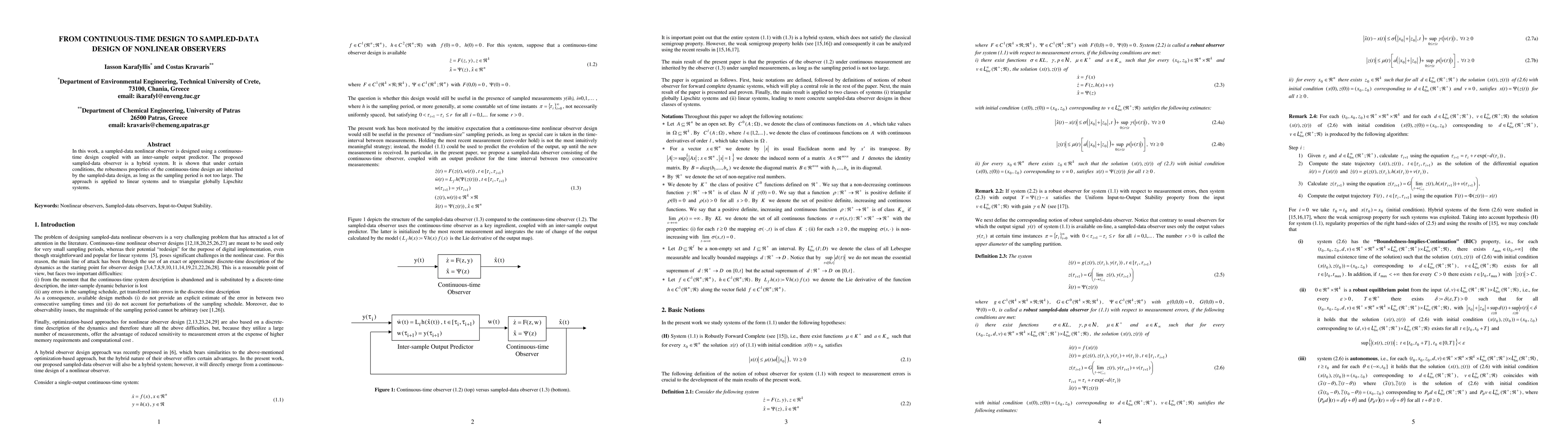 This paper designs a sampled-data nonlinear observer by combining continuous-time design with an inter-sample output predictor, demonstrating that robustness properties are preserved under appropriate sampling periods. The method is tested on linear and triangular globally Lipschitz systems.