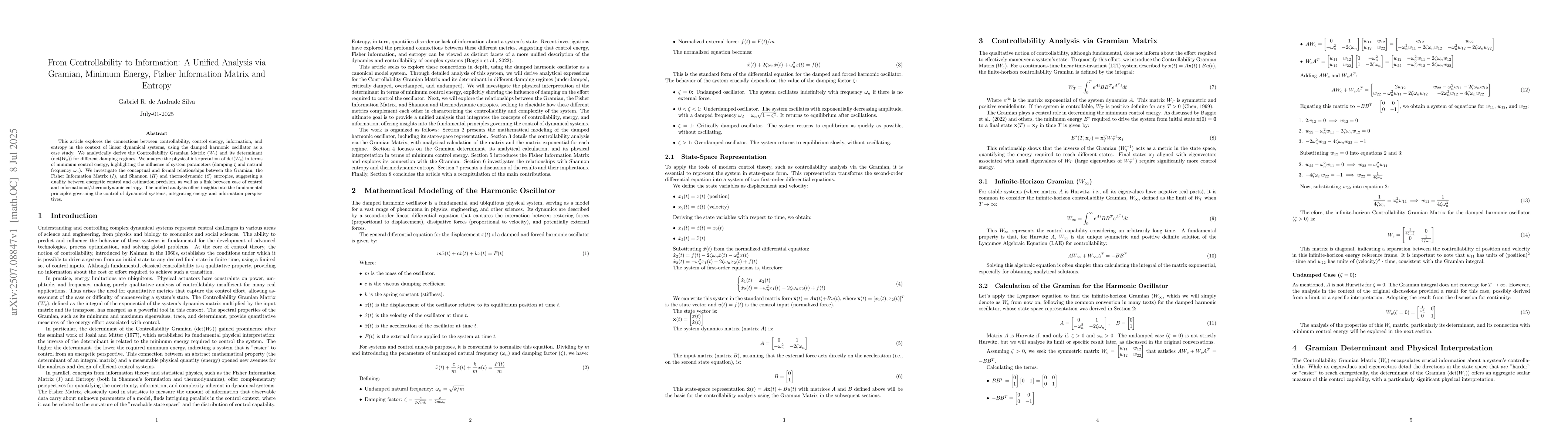 This article explores the connections between controllability, control energy, information, and entropy in the context of linear dynamical systems, using the damped harmonic oscillator as a case study. We analytically derive the Controllability Gramian Matrix (Wc) and its determinant (det(Wc)) for different damping regimes. We analyze the physical interpretation of det(Wc) in terms of minimum control energy, highlighting the influence of system parameters (damping {\zeta} and natural frequency {\omega}n). We investigate the conceptual and formal relationships between the Gramian, the Fisher Information Matrix (I), and Shannon (H) and thermodynamic (S) entropies, suggesting a duality between energetic control and estimation precision, as well as a link between ease of control and informational/thermodynamic entropy. The unified analysis offers insights into the fundamental principles governing the control of dynamical systems, integrating energy and information perspectives.